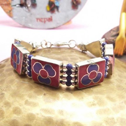 Blue & Red Coral & Lapis Inlaid Stone Bracelet