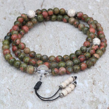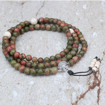- Bead Size: 8 mm Unakite, 10 mm Guru bead