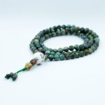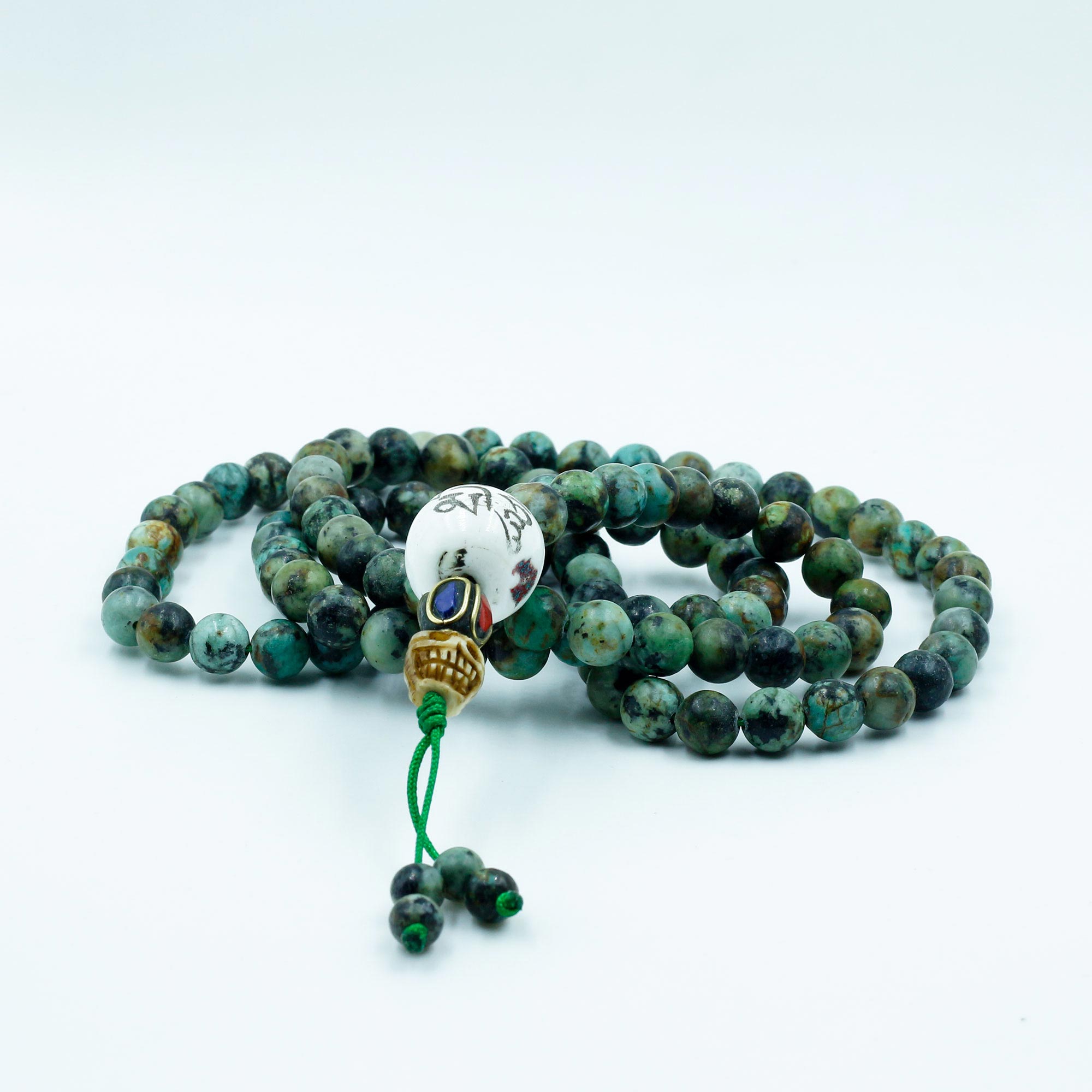 African Turquoise Stone Mala is believed to support personal growth, transformation, and inner balance. African turquoise is traditionally associated with change and new beginnings, helping encourage confidence and positive life direction. It is thought to calm the mind and support emotional stability during meditation or prayer. The inlaid bead adds decorative beauty and is believed to strengthen focused intention. The yak bone skull symbolizes impermanence, awareness, and the wisdom of letting go of ego. Tibetan mantra engraved on the conch shell is traditionally regarded as a source of protection and spiritual guidance. The combination of materials represents a balance of grounding, awareness, and devotion. It is commonly used for japa, mindfulness, and focused chanting practices. The beads are comfortable to handle and suitable for daily spiritual routines. Overall, it is valued for its symbolic depth, balanced energy, and traditional craftsmanship.