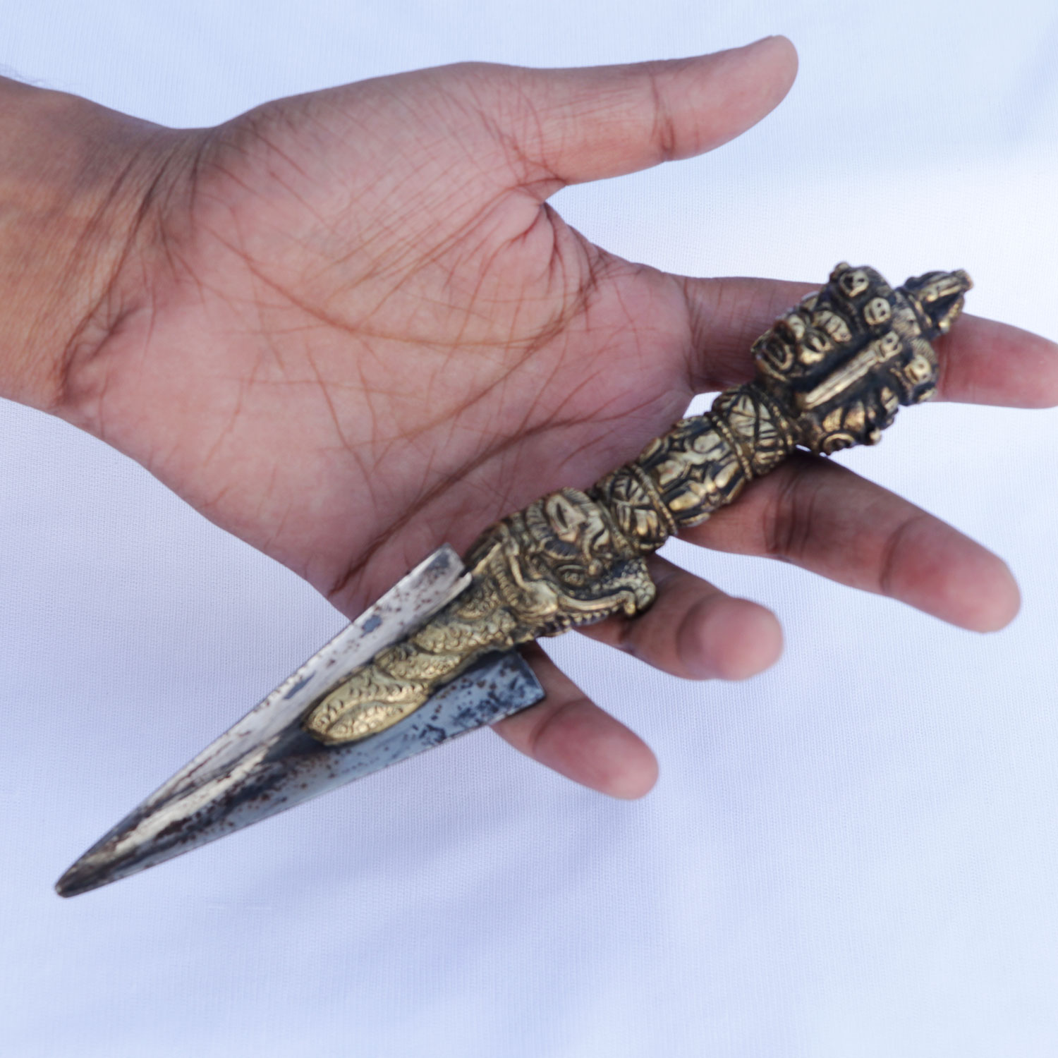 Antique Brass Mahakala Phurba is a powerful ritual dagger believed to cut through spiritual obstacles and negative energies. It is not a weapon, but a sacred tool for protection and transformation. The fierce deity Mahakala represents the powerful, compassionate force that destroys ignorance, fear, and inner demons. Practitioners use the phurba symbolically to “pin down” and dissolve these negative influences, creating a sacred and safe space. It is thought to help break apart old, stagnant patterns and attachments that hold a person back. By confronting and dismantling these inner blockages, the phurba is said to pave the way for positive growth and spiritual awakening. Ultimately, it serves as a reminder of the strength within to overcome challenges and achieve a state of clarity and liberation.