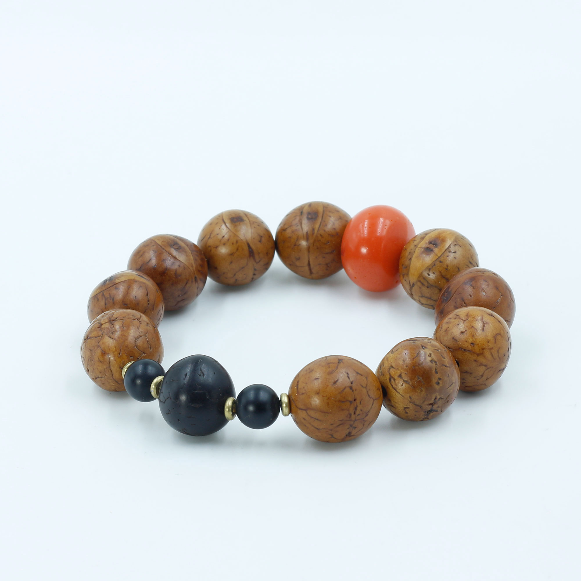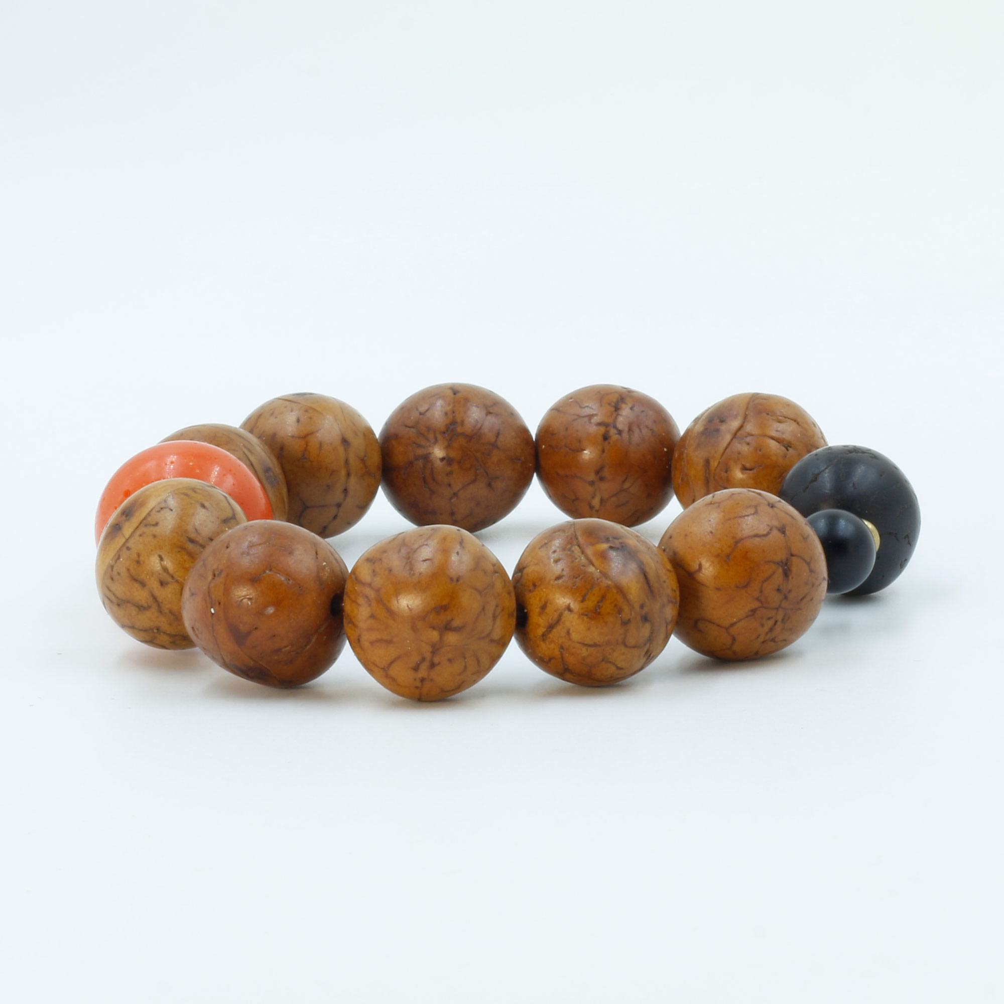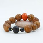 Antique Light Brown Phoenix Eye Bodhi Seed Wrist Mala with Coral Bead Spacer and Black Onyx