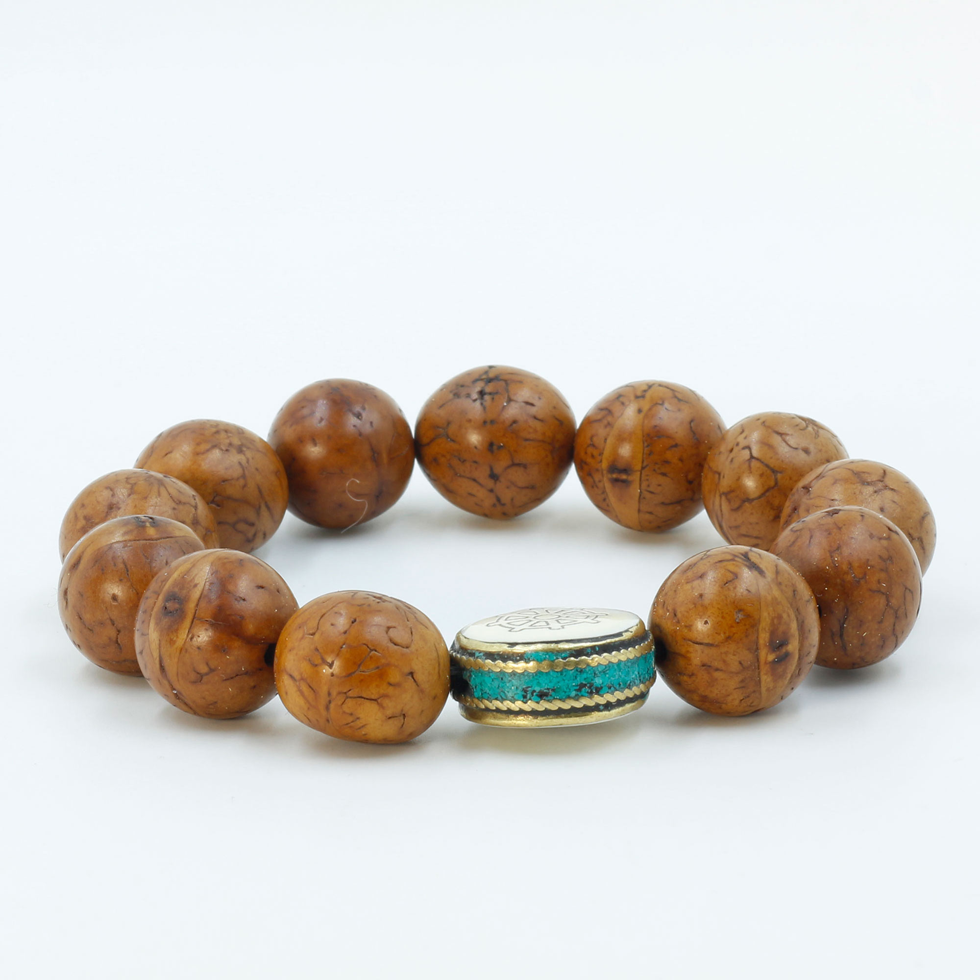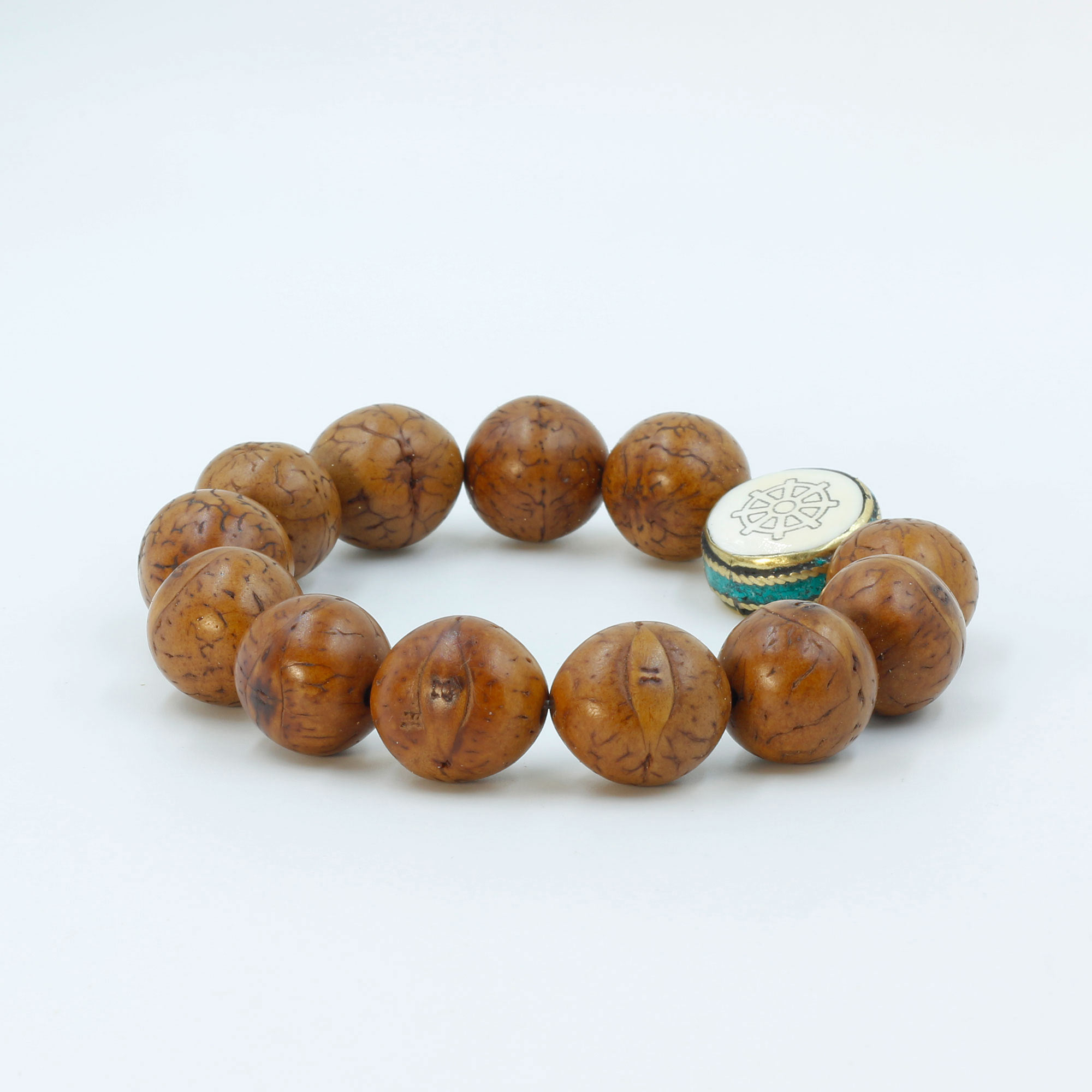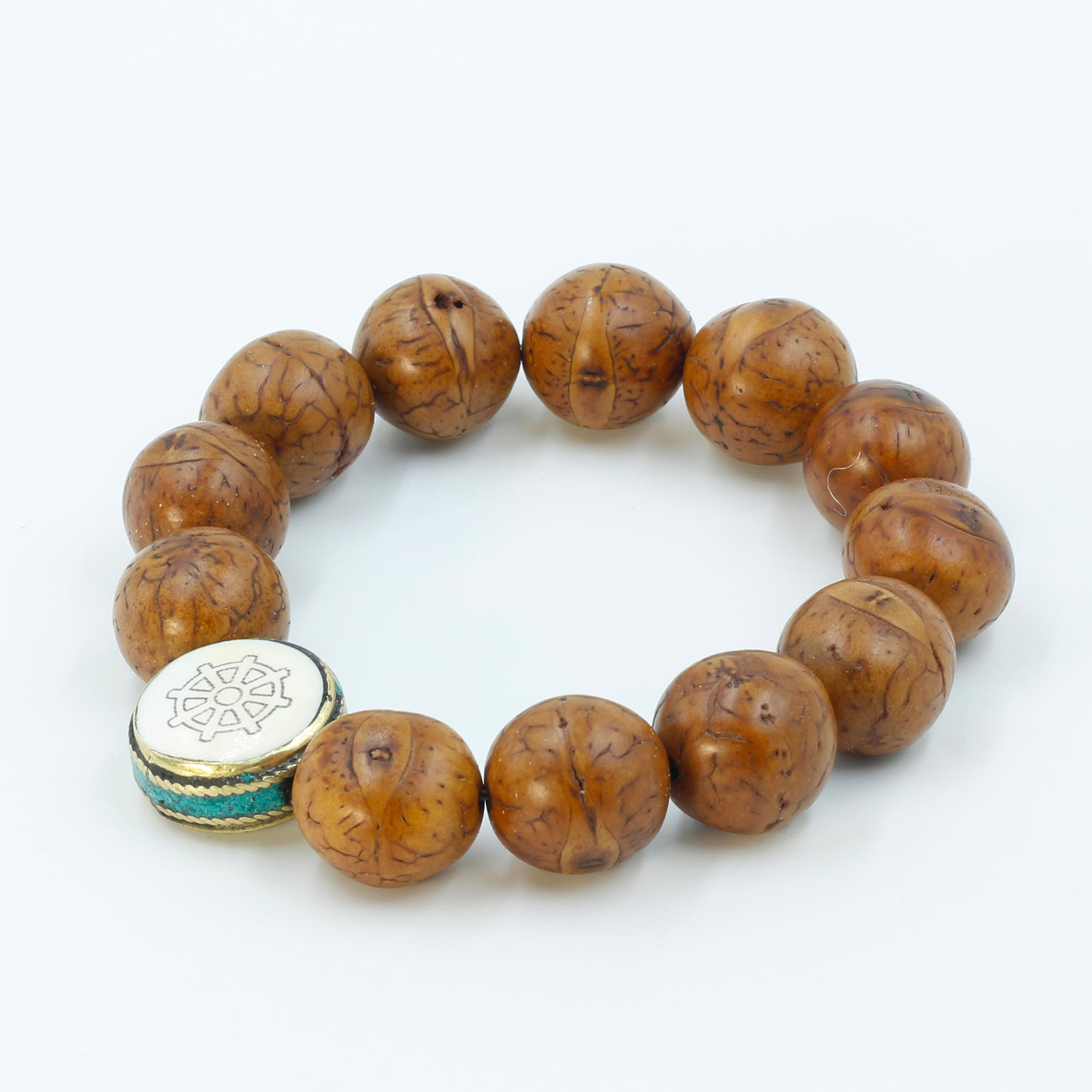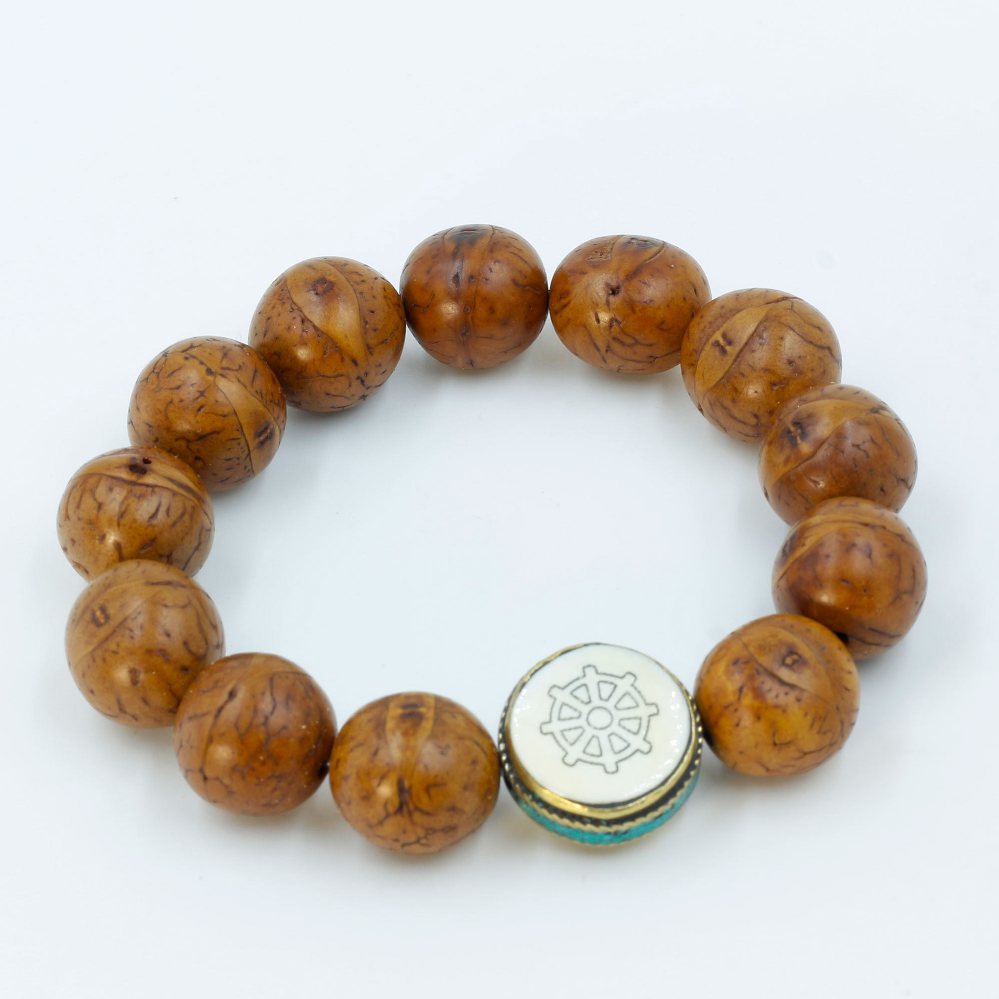 Antique Light Brown Phoenix Eye Bodhi Seed Wrist Mala with Dharma Wheel on Conch Shell