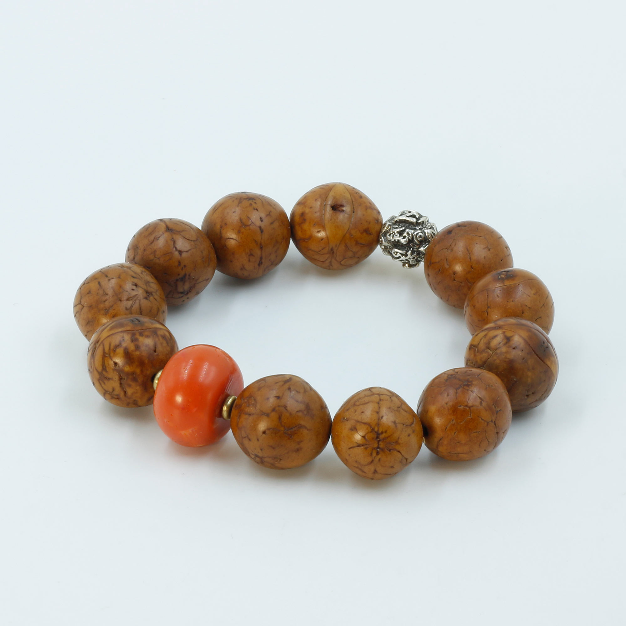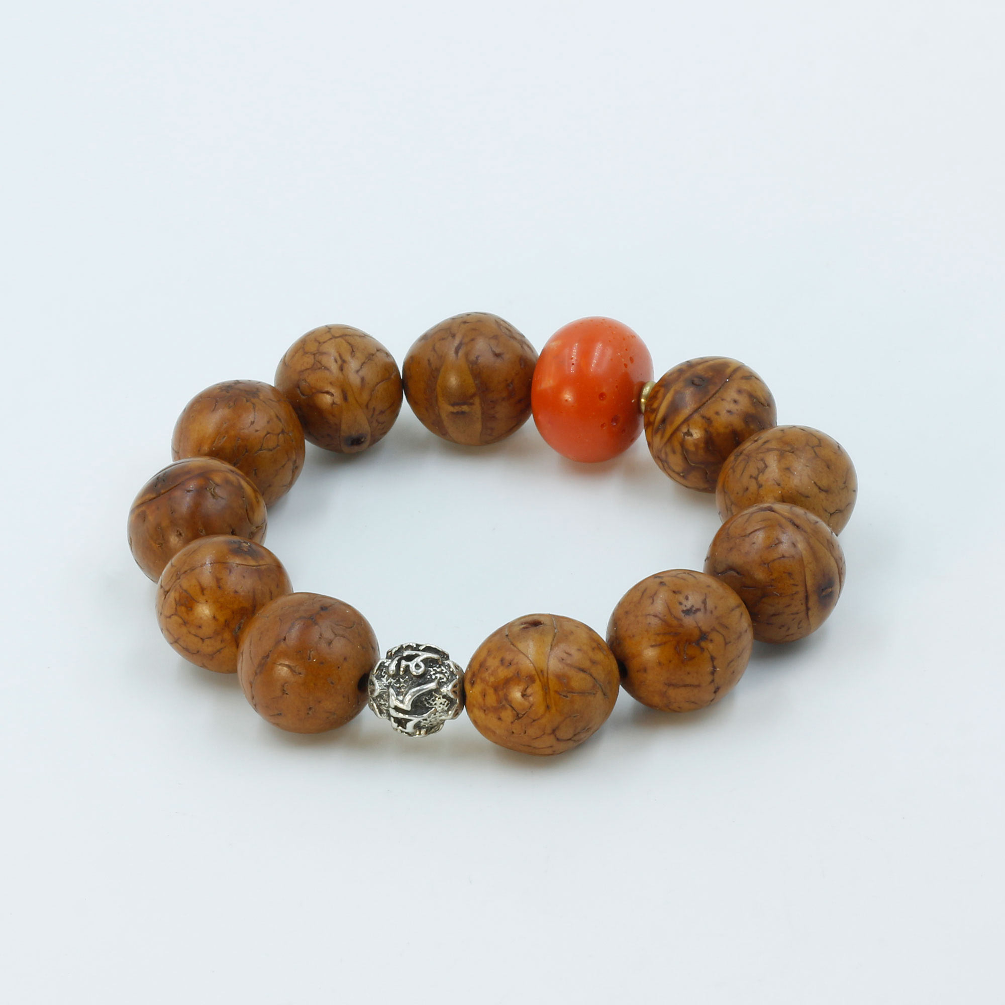 Bead Count: 11 Bodhi Seed, 1 Coral Bead, 1 Metal Bead