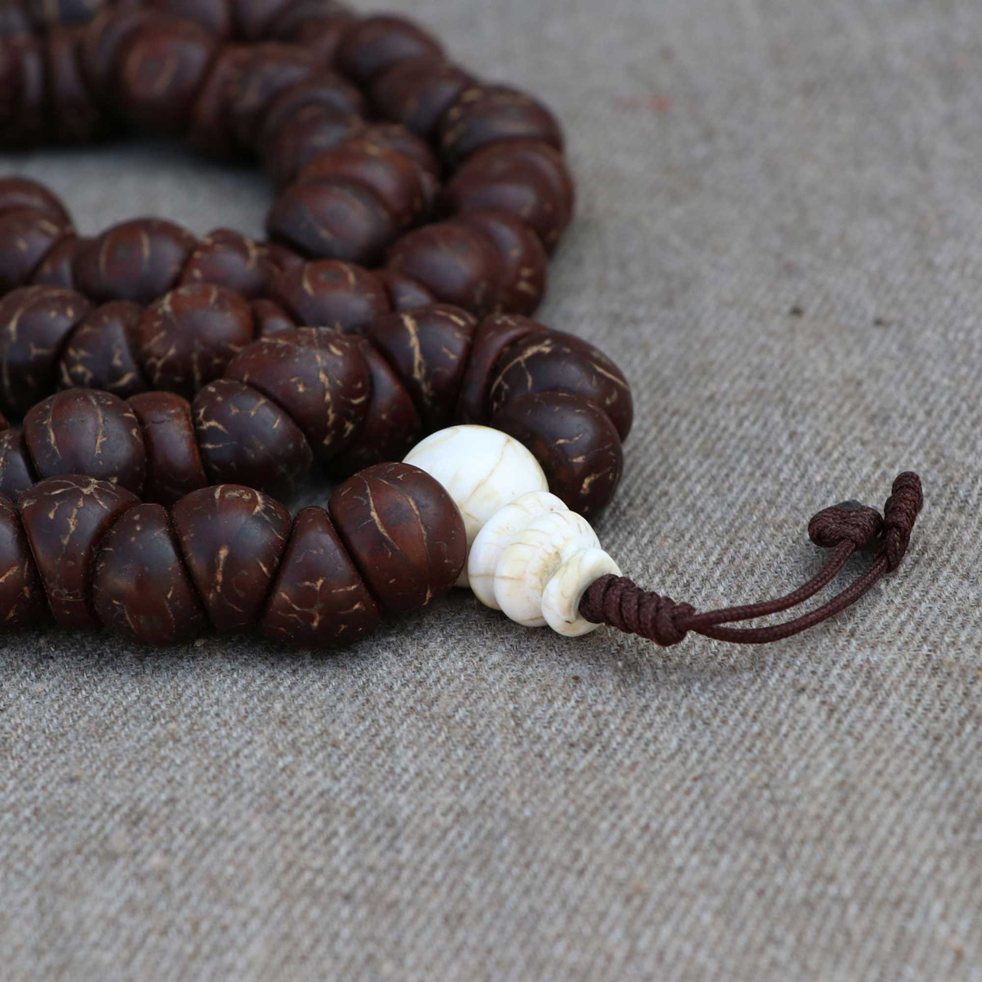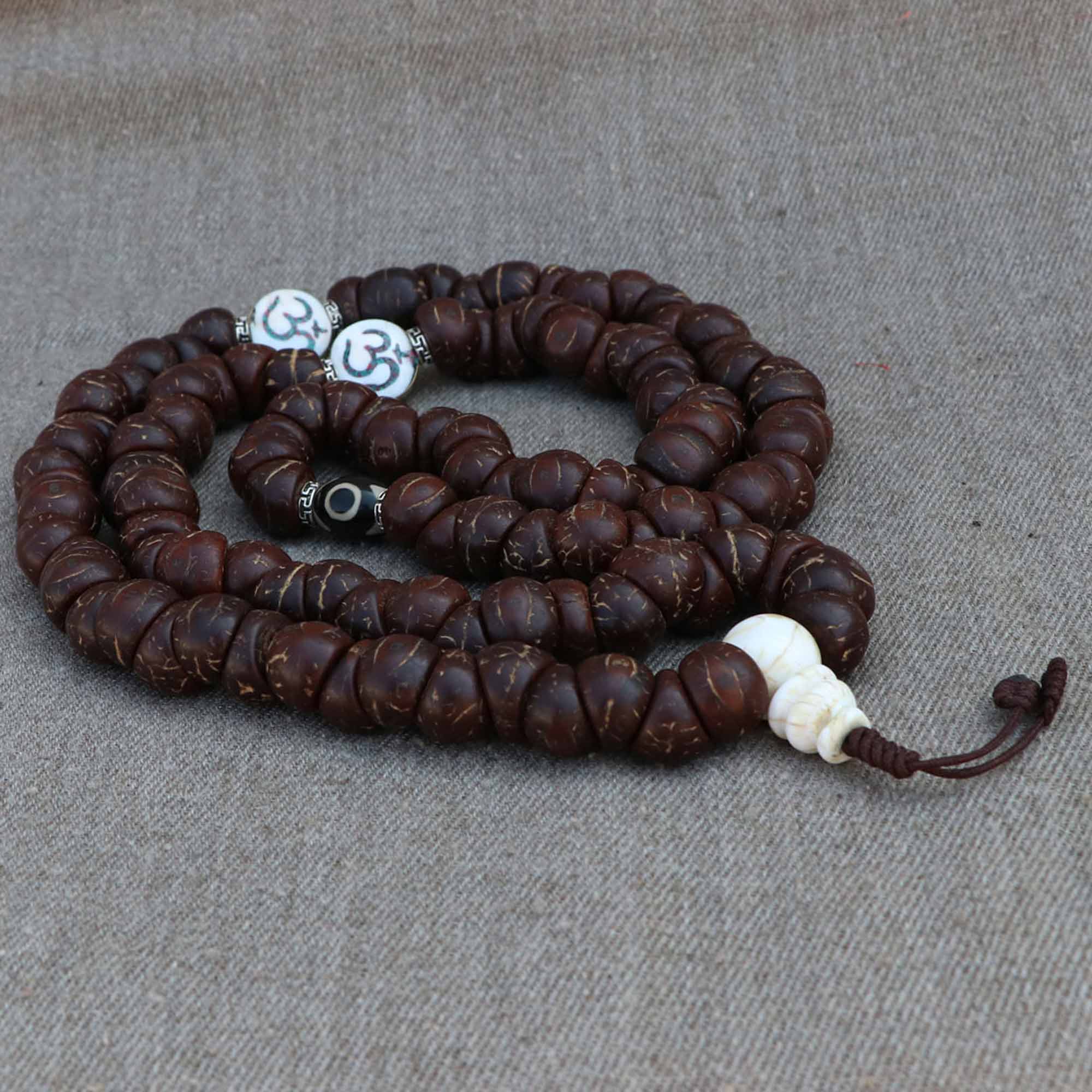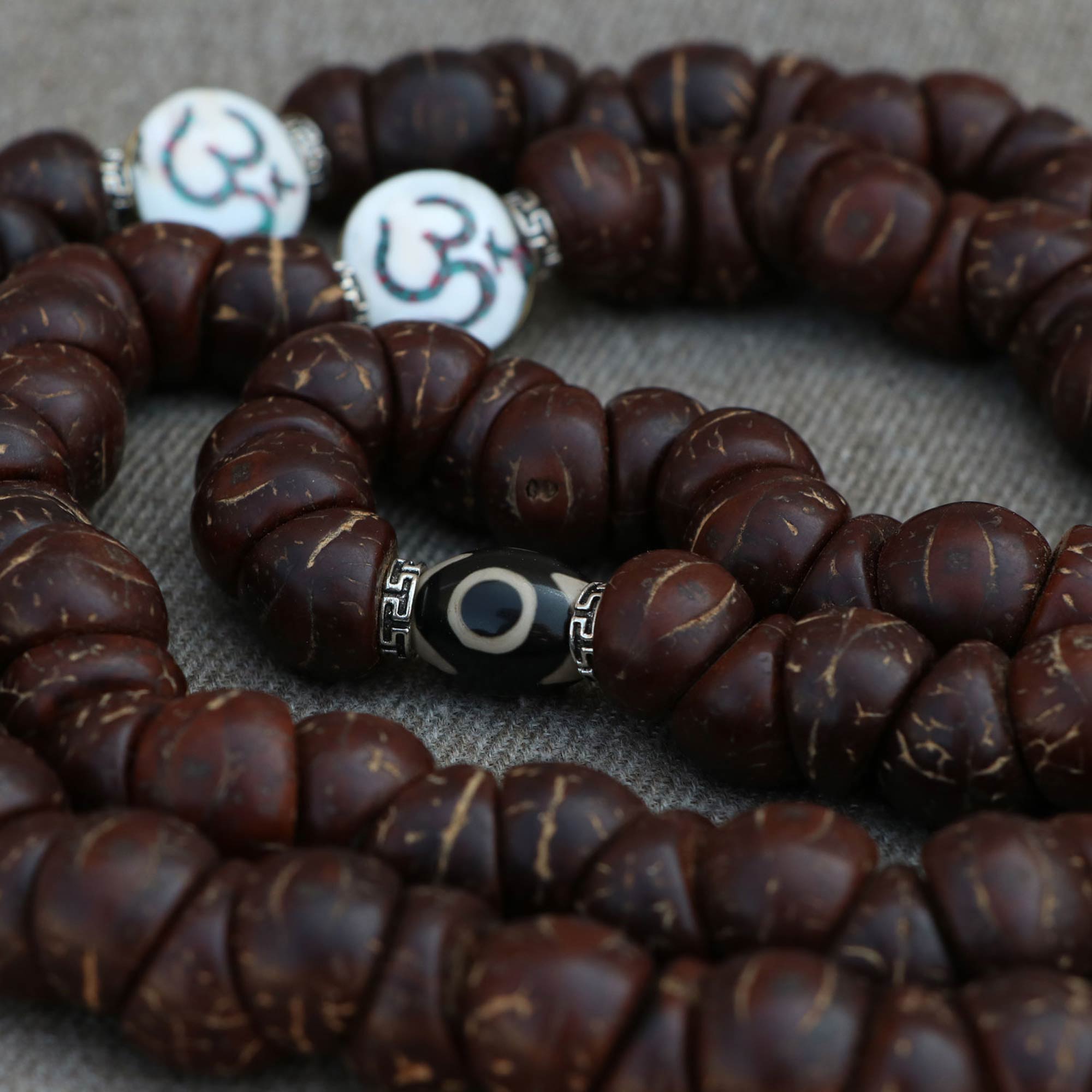 Upgrade to the perfect Antique One Eye Nepali Bodhi Seed Yoga Mala with Om Spacer from Lotus Mala (Lotus Handicrafts).