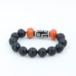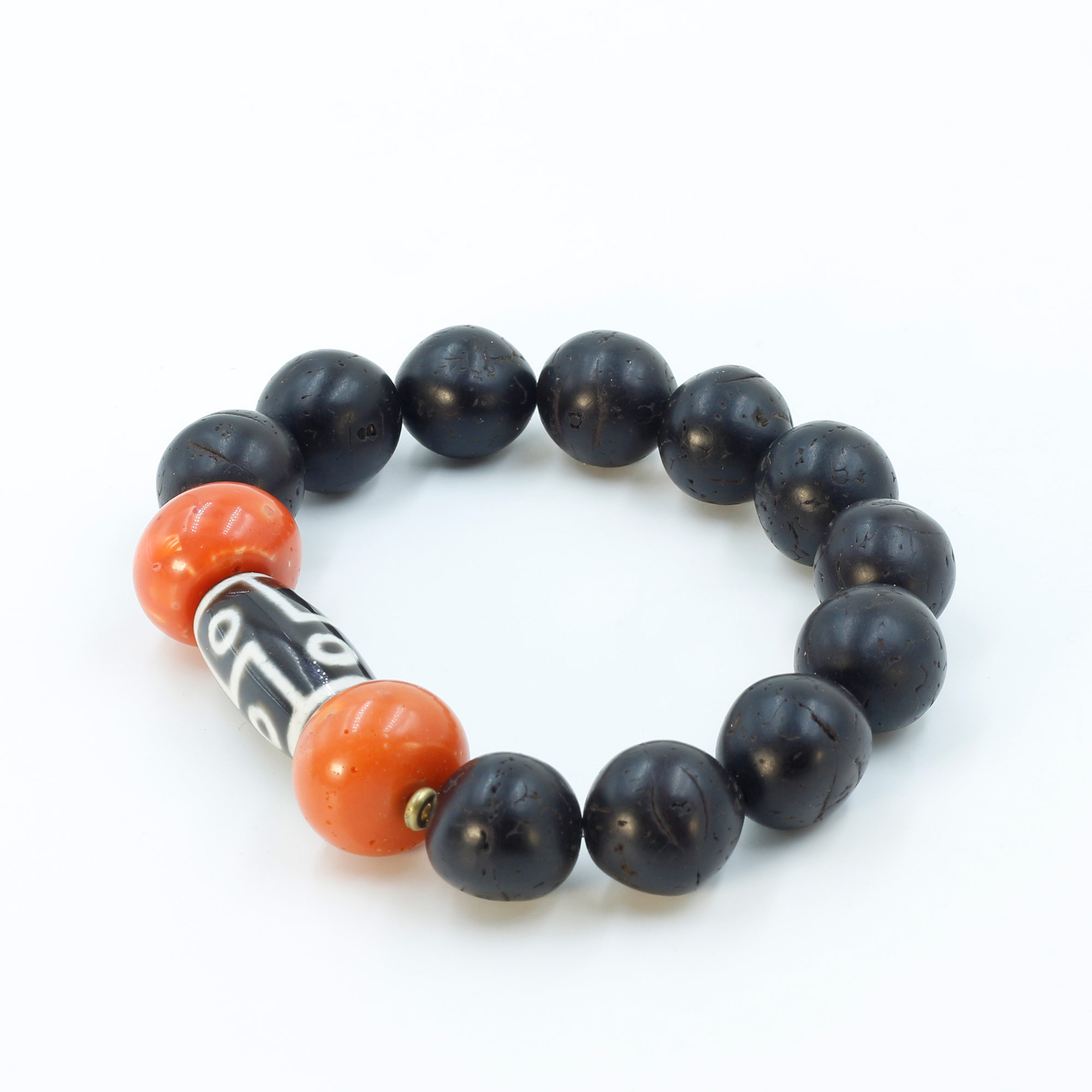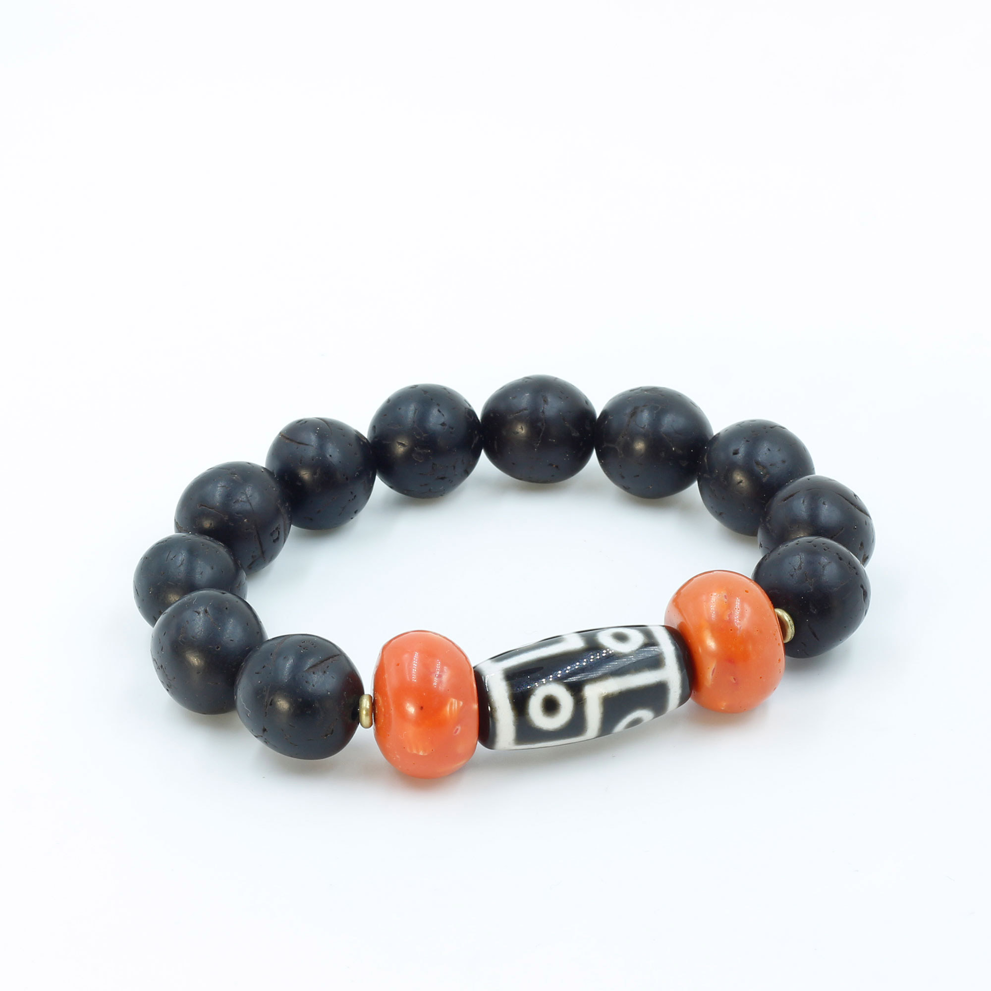 Choose the timeless beauty of Antique Phoenix Eye Bodhi Seed Wrist Mala with Coral beads and 9 Eye Dzi Head from Lotus Mala (Lotus Handicrafts).