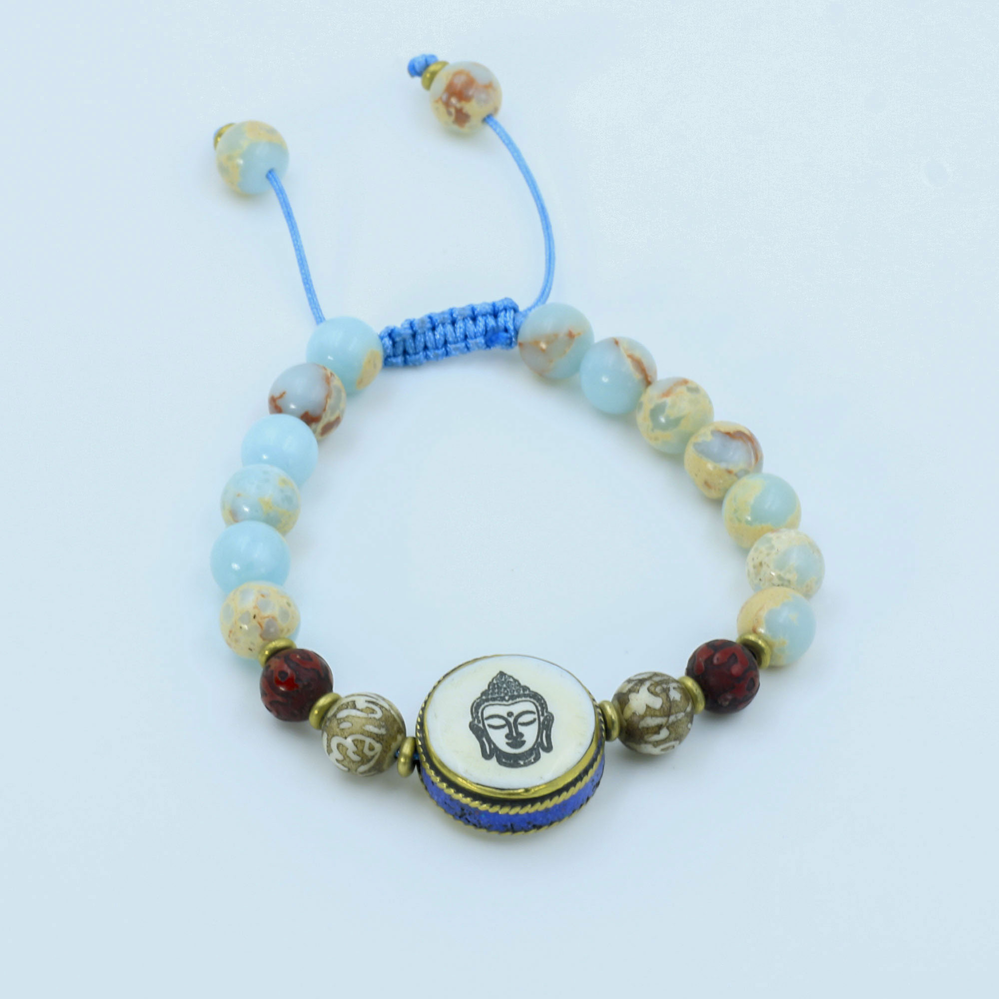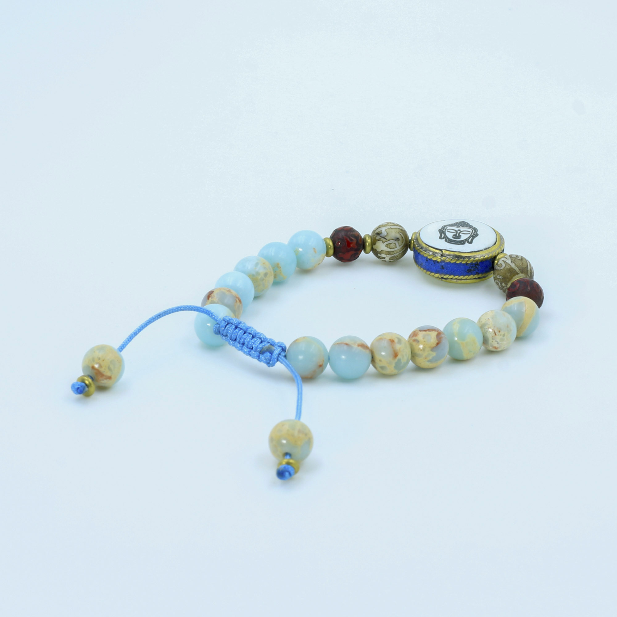 The Aqua Tera Jasper Stone Wrist Mala is believed to promote grounding and emotional balance. Aqua Tera Jasper is often associated with harmony, patience, and a deep connection to nature. Many believe it supports inner stability while encouraging steady personal growth. Coral elements are traditionally linked with vitality, confidence, and positive life energy. Conch shell beads symbolize purity and clarity, often associated with calming the mind and enhancing awareness. The Tibetan mantra carving is thought to encourage focused intention and mindful repetition during prayer or meditation. The Buddha carving represents wisdom, compassion, and inner peace. Together, these elements are believed to help ease emotional stress and encourage calm decision-making. This wrist mala is commonly worn as a reminder of balance and conscious living. It is valued for its calming presence and meaningful spiritual symbolism.