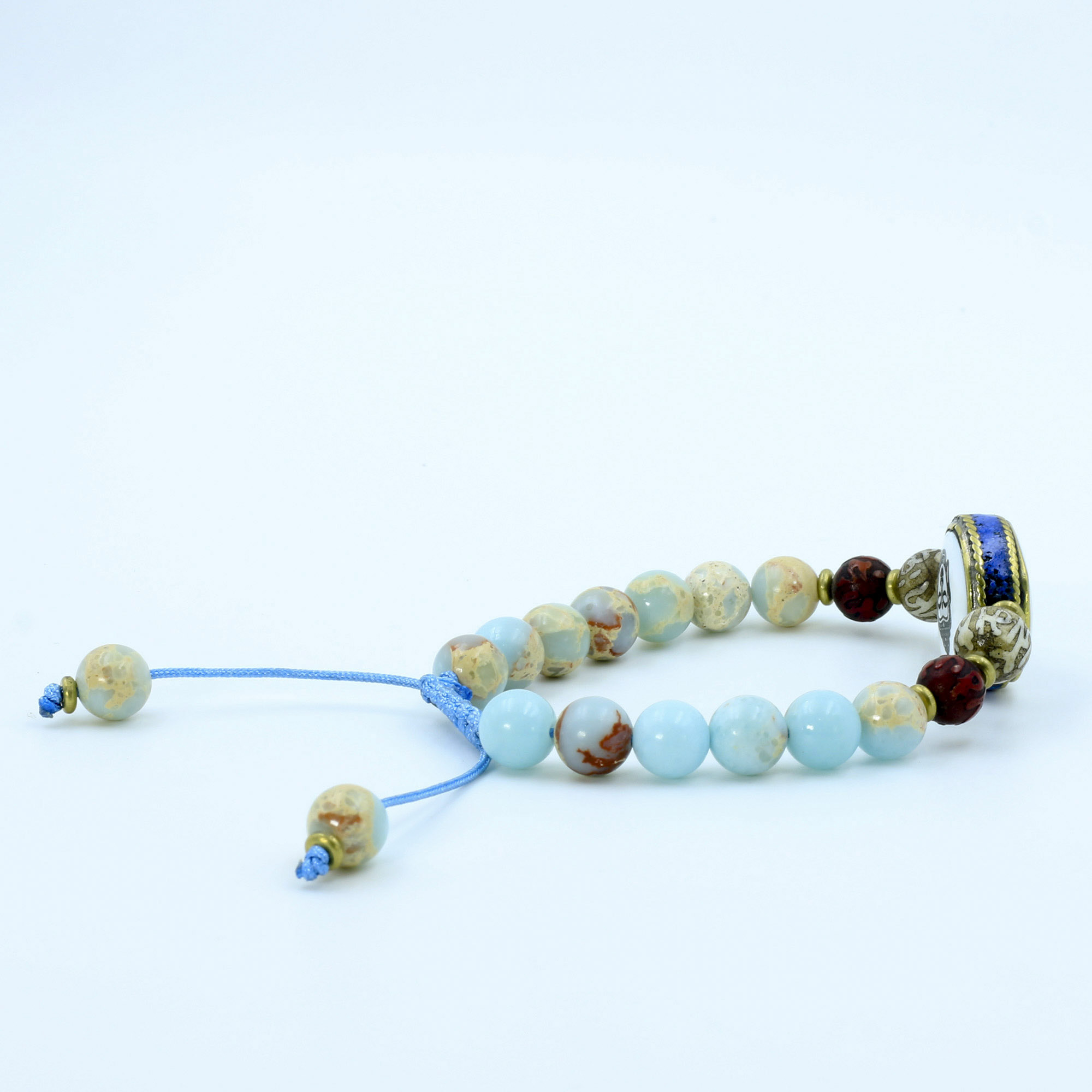 Aqua Tera Jasper Stone Wrist Mala with Coral and Conch Shell with Tibetan Mantra and Buddha Laser Carving