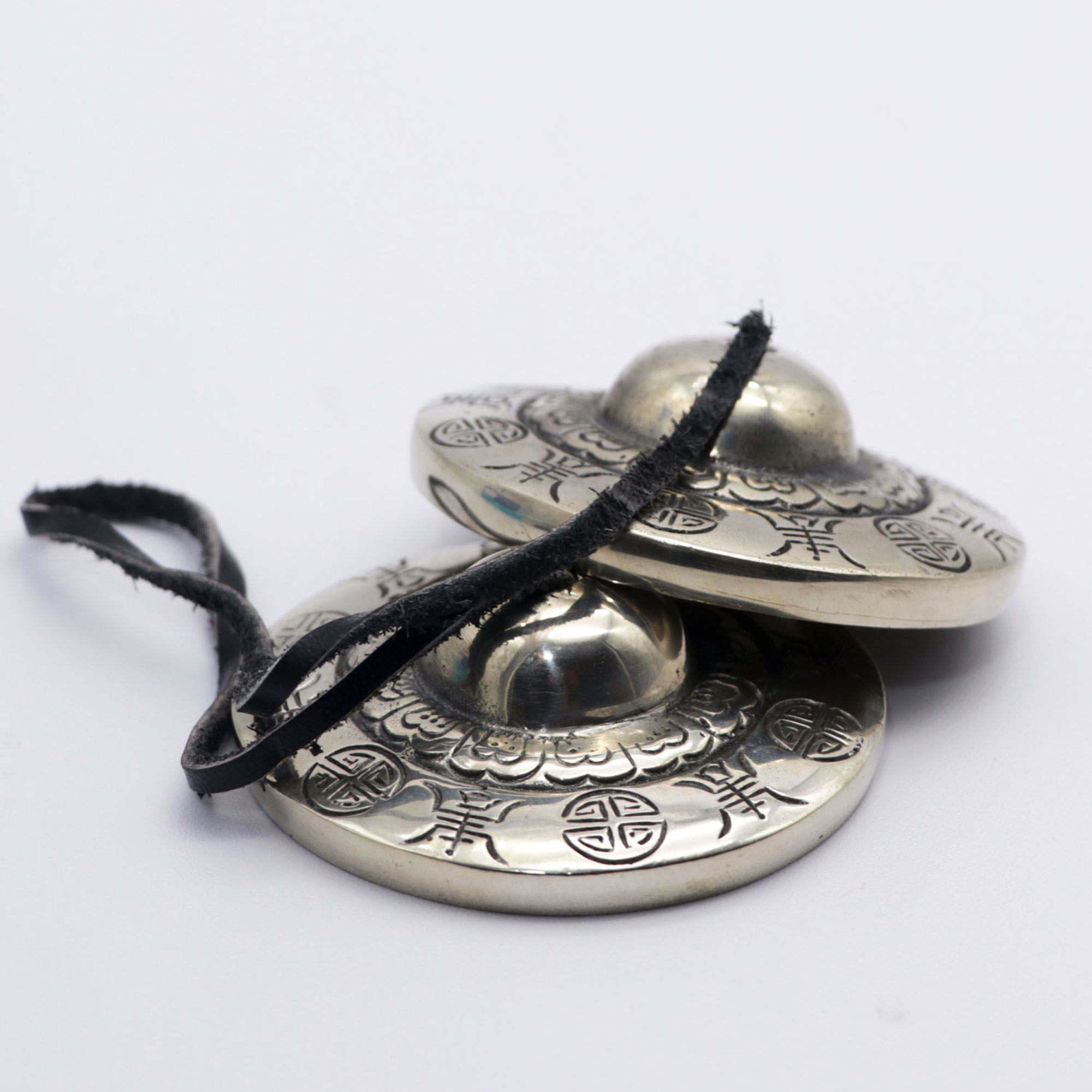 Tingsha bells are sacred musical instruments rooted in Tibetan and Himalayan spiritual practices, renowned for their pure, high-pitched tone used in meditation, ritual cleansing, and sound healing. These special Tingsha bells are intricately engraved with the Eight Auspicious Symbols (Ashtamangala), adding profound spiritual meaning to each vibration. Expertly handcrafted in Nepal, they are made from brass, a traditional material valued for both its tonal clarity and spiritual significance.
