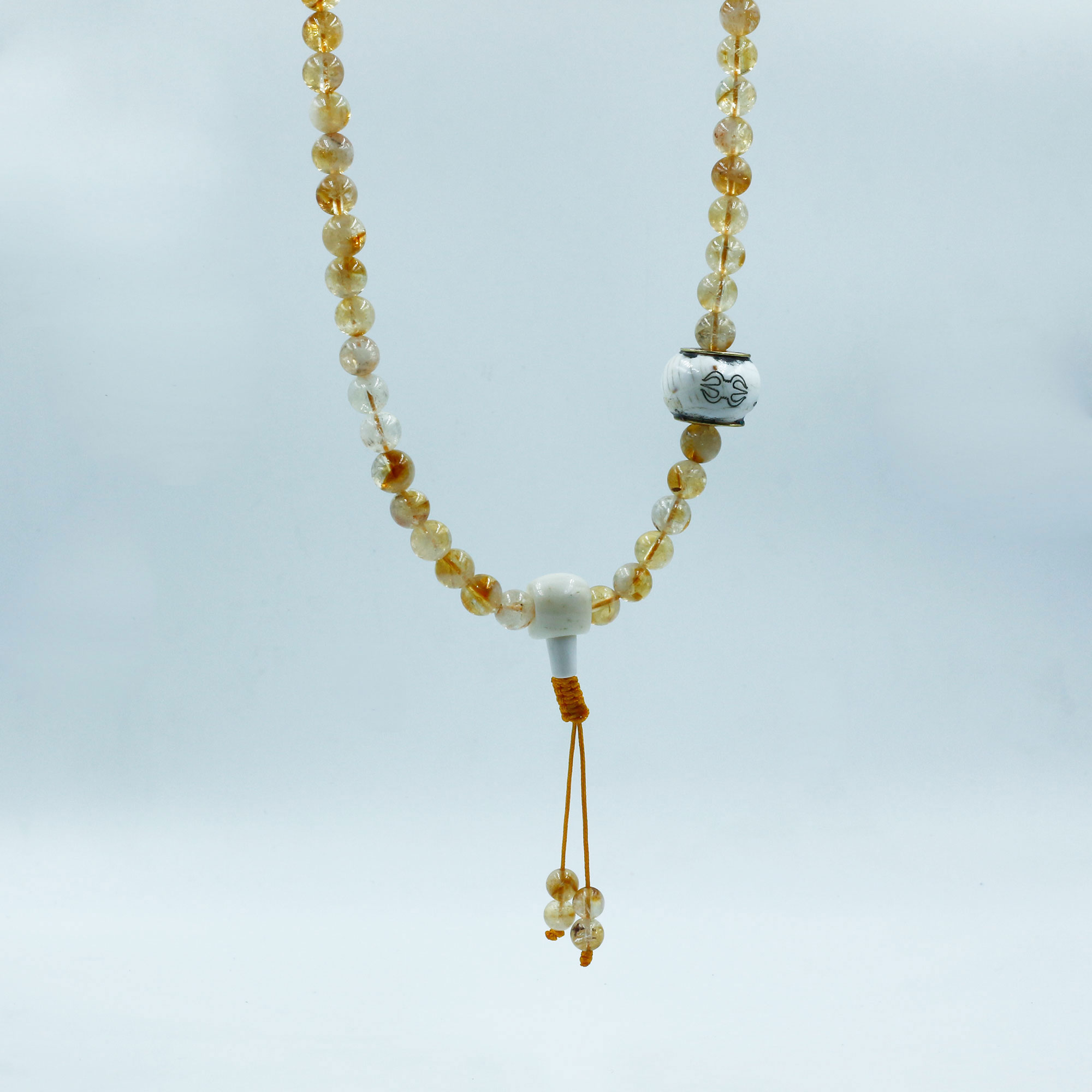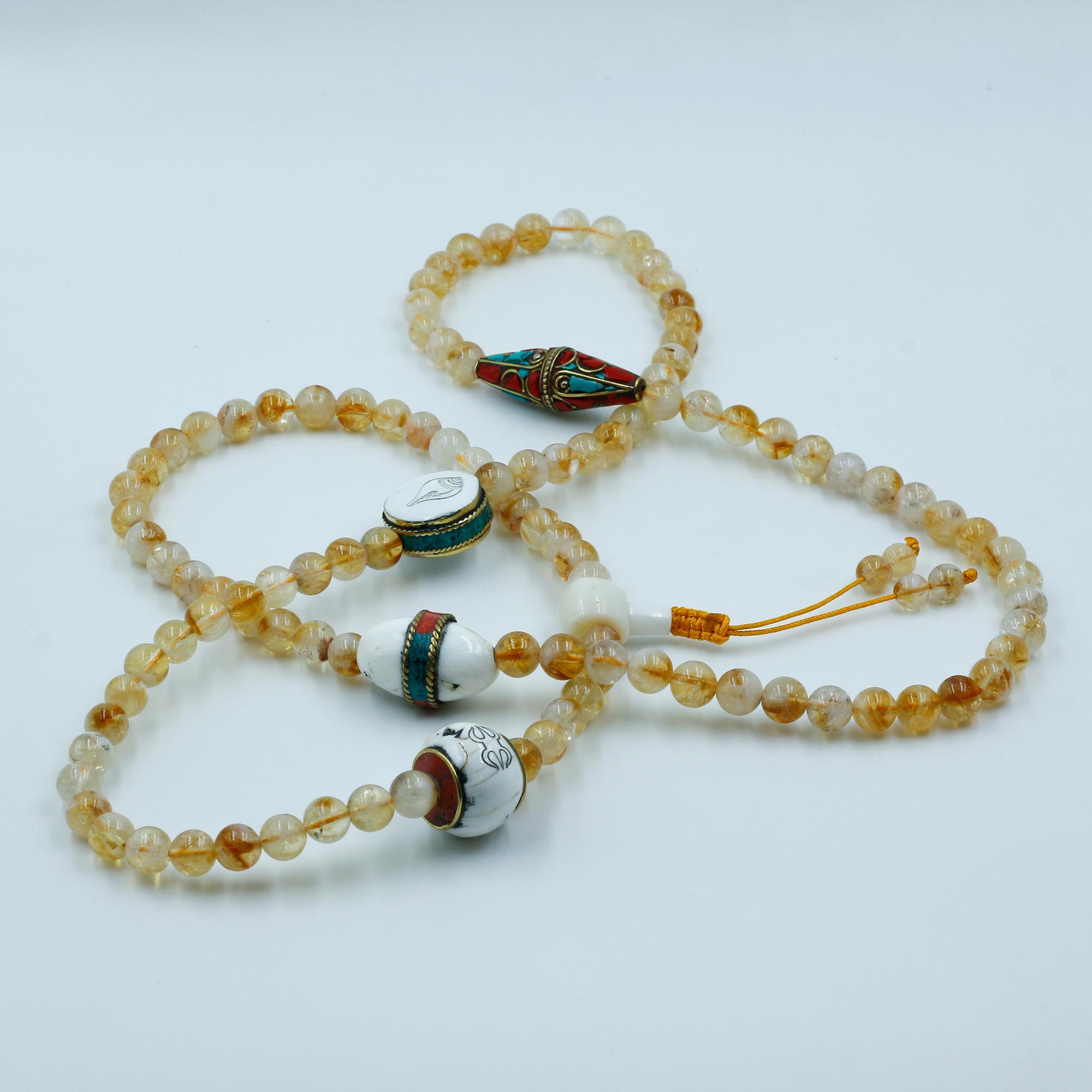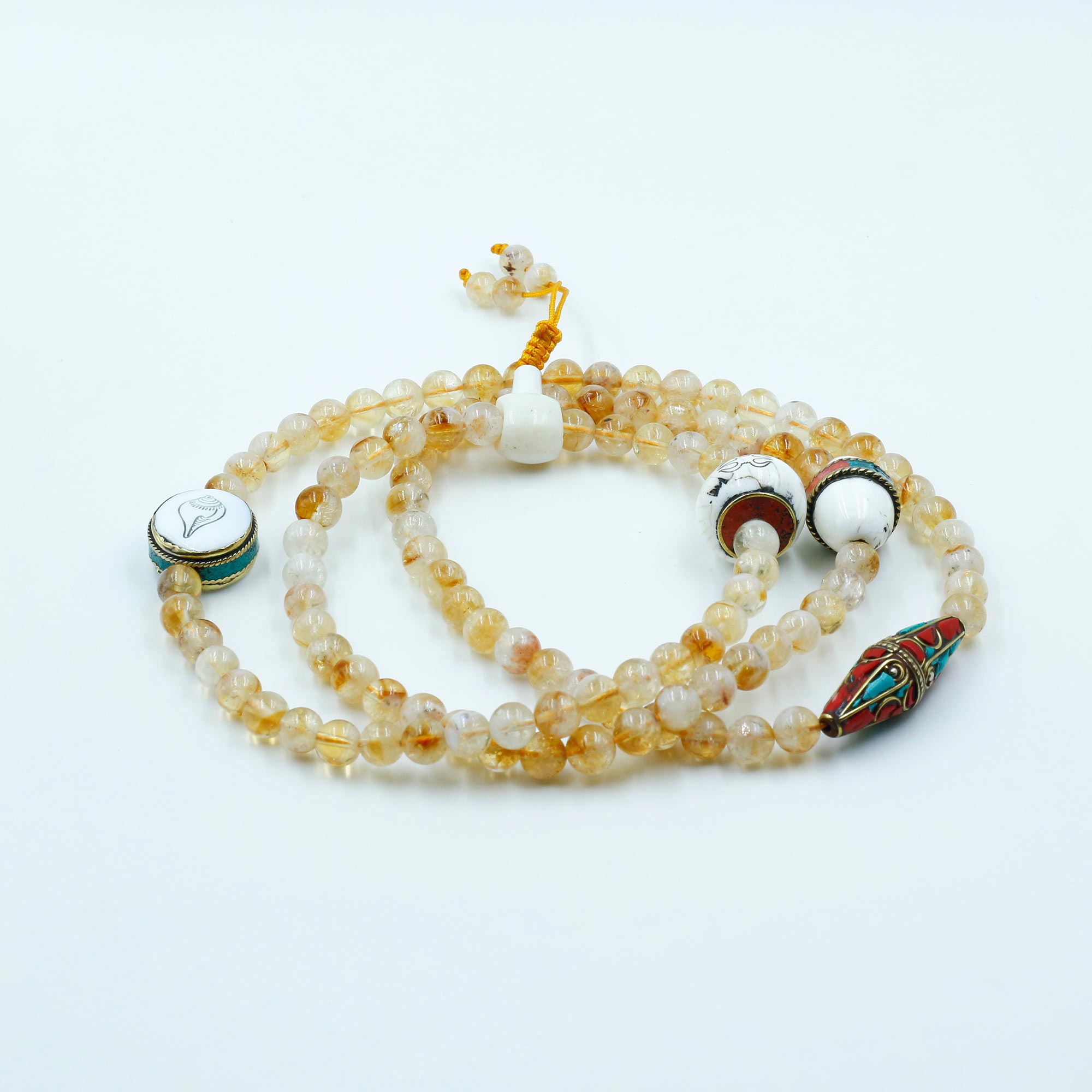 Bead Count: 108 Citrine Stone Beads + 3 Conch Shell Beads + 1 Inlaid Bead
