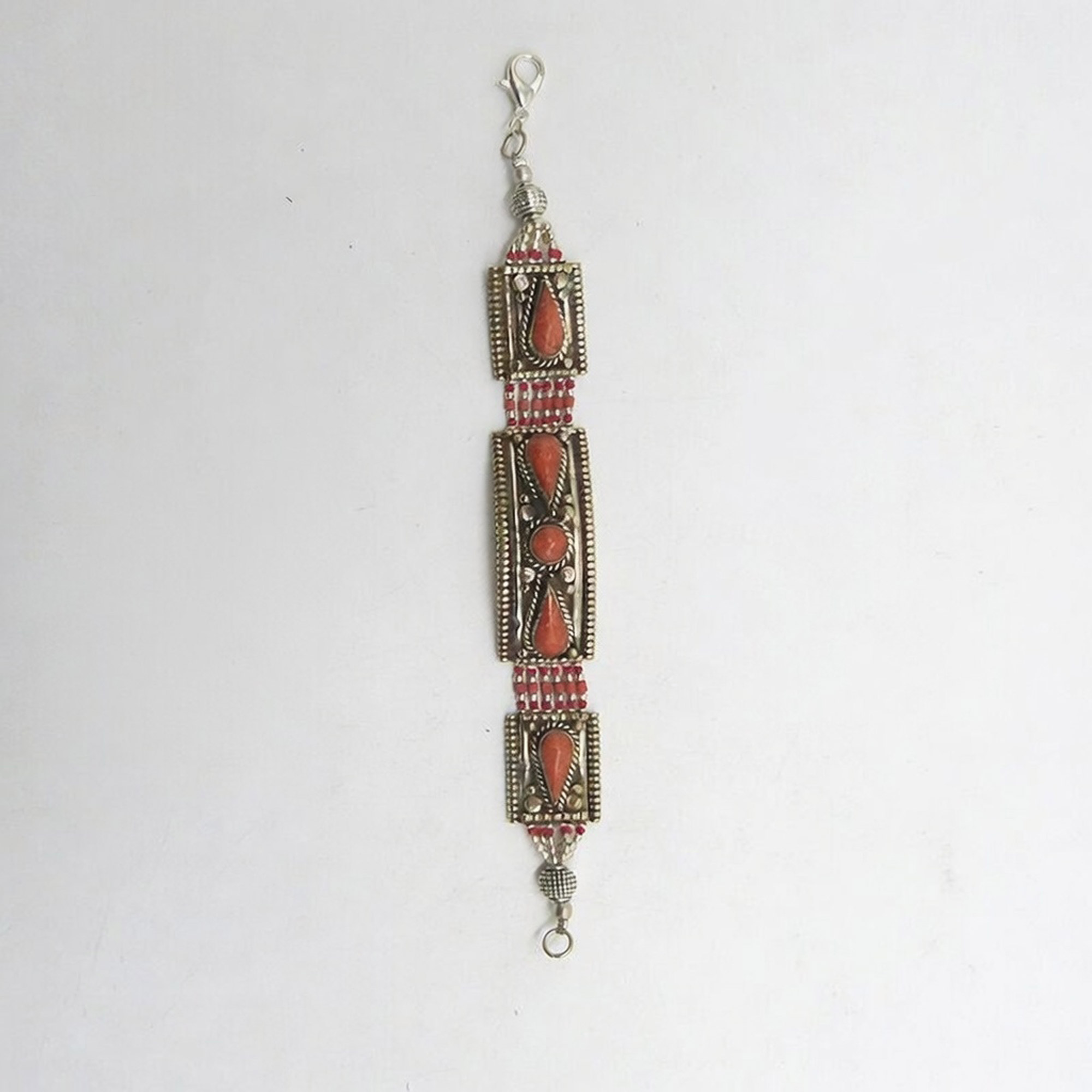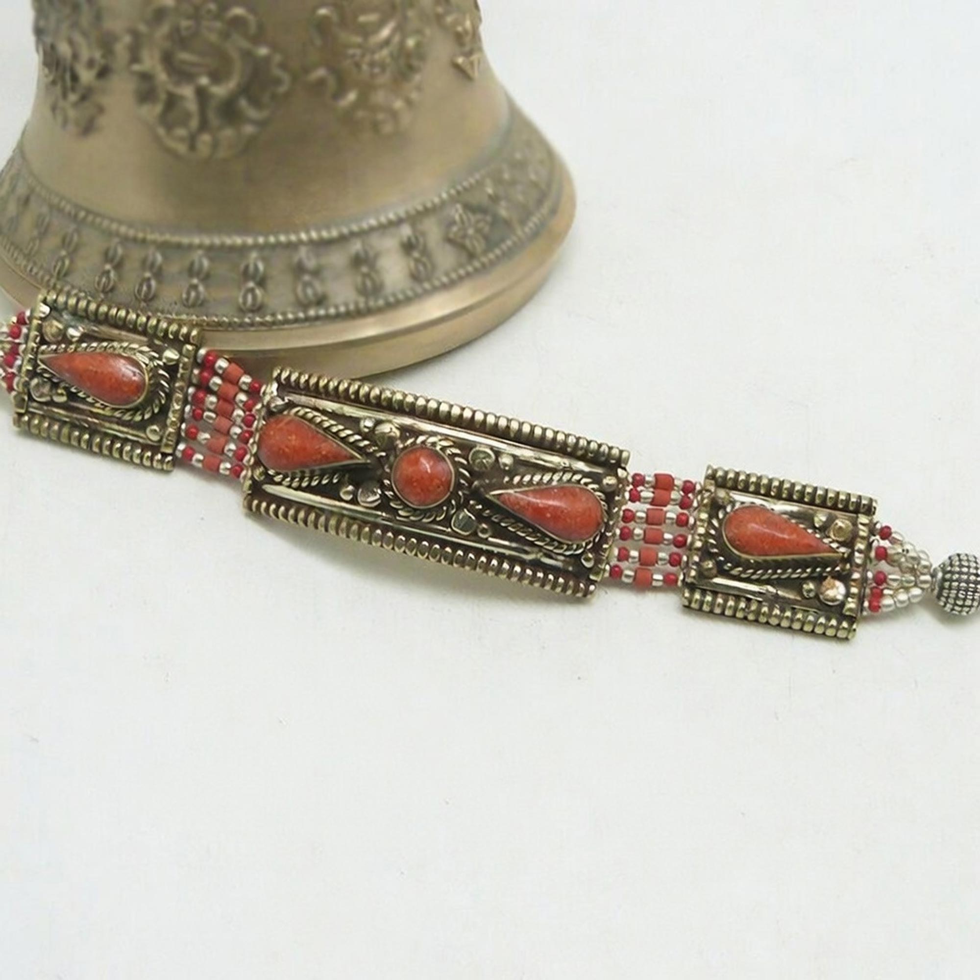 The white metal base is known for its calming properties, helping to soothe the mind and stabilise emotions. The coral stone, often called the stone of vitality, promotes life force, energy, and emotional strength. Together, they create a bracelet that supports both mental tranquillity and physical vitality. The intricately inlaid designs further add to its aesthetic appeal, making it a stylish accessory for daily wear or gifting.