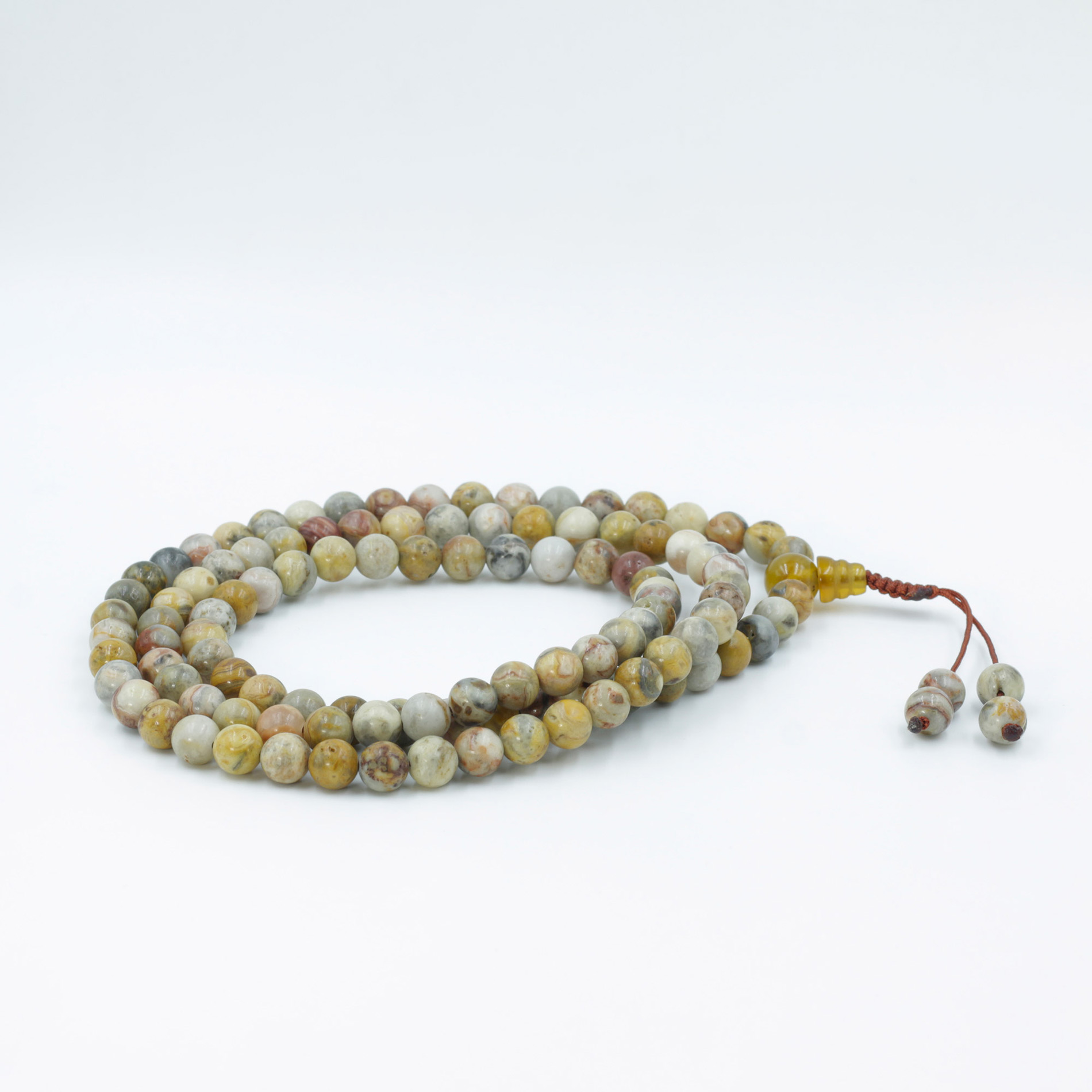Experience warmth, stability, and emotional balance with the Grounding Australian Butter Jasper Meditation Mala from Lotus Mala (Lotus Handicrafts).