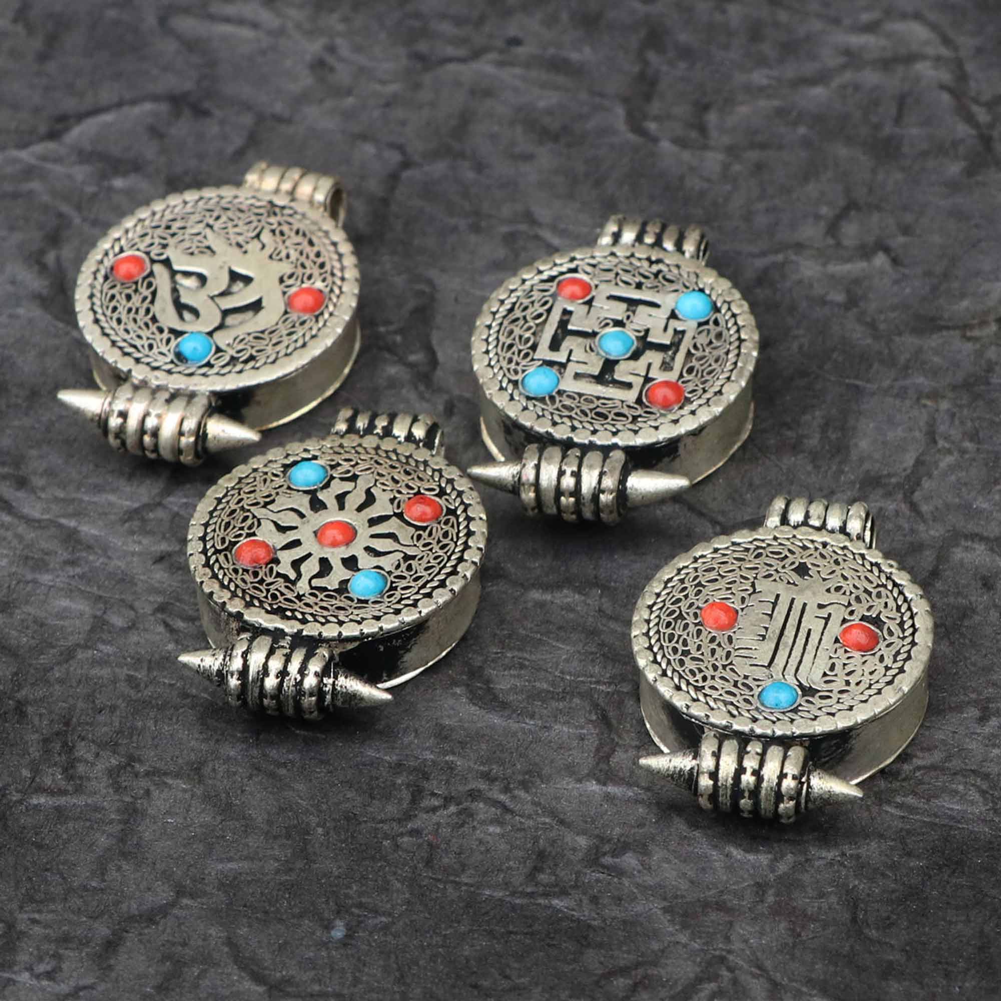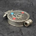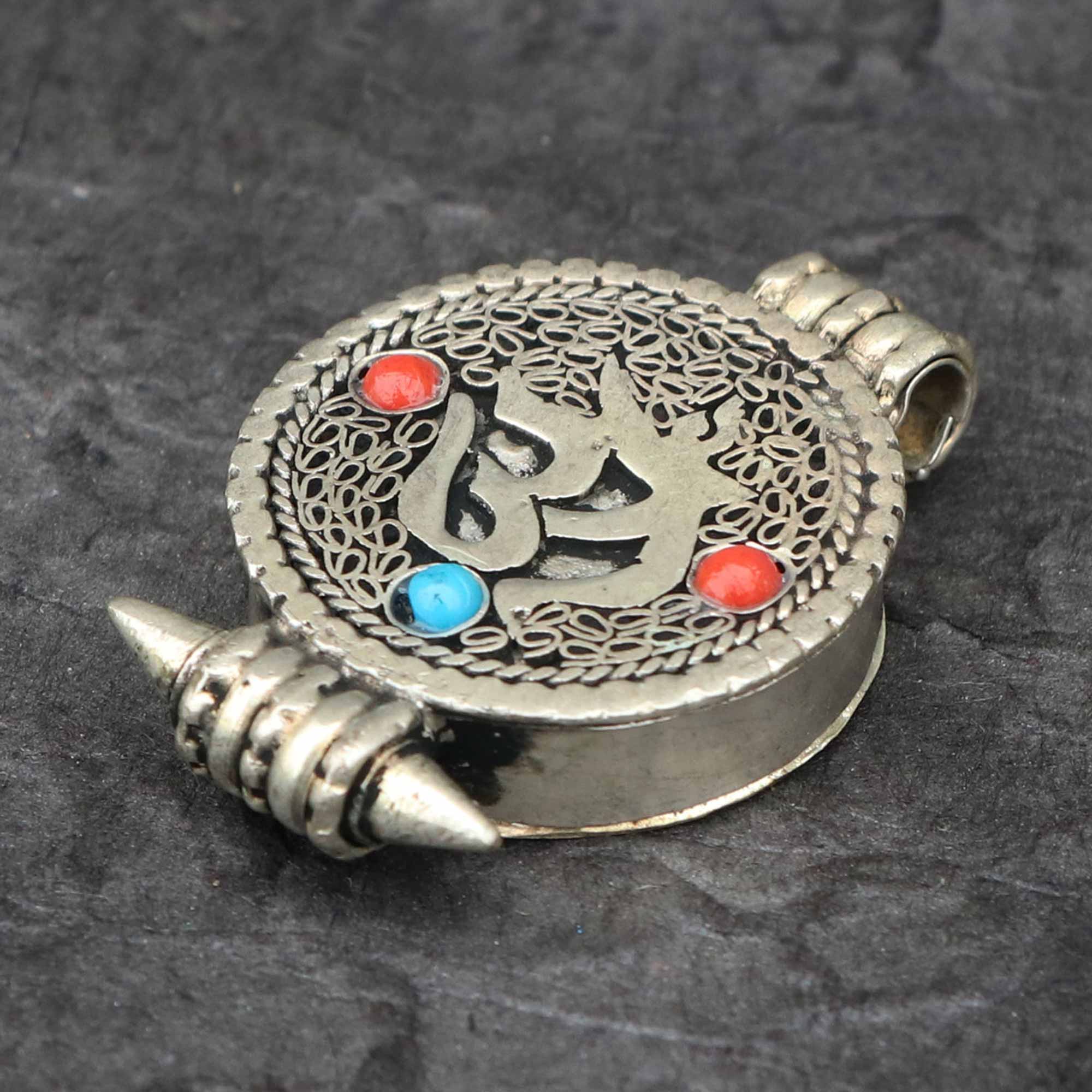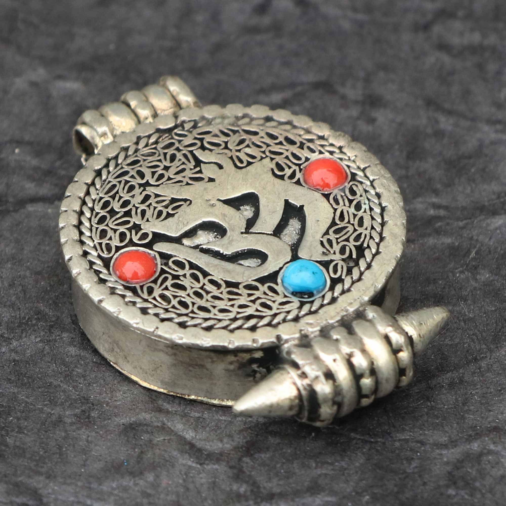 The ghau is further adorned with imitation coral and turquoise, adding rich layers of meaning. Imitation coral represents vitality, courage, and life force, while promoting emotional healing and protection from harm. It is also linked to prosperity, fertility, and transformation. Imitation turquoise is known as a stone of healing and balance, fostering peace, truth, self-expression, and spiritual wisdom. Together, these stones amplify the ghau’s spiritual energy, uniting protection, vitality, and healing into a single powerful talisman.