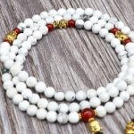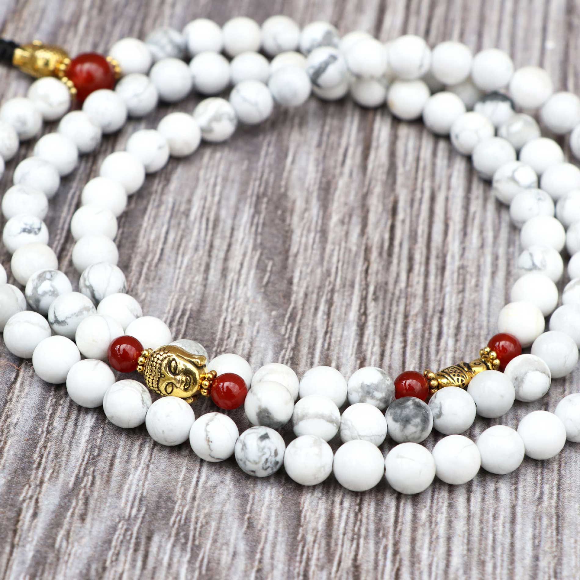 - Handcrafted in Nepal featuring 108 howlite stone beads at 8 mm with carnelian accents and white metal spacers