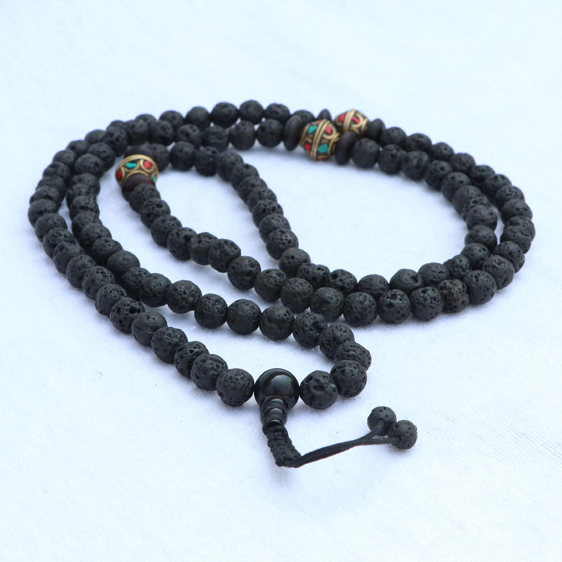 - Bead Number: 108 Lava Stone, 3 Inlaid brass