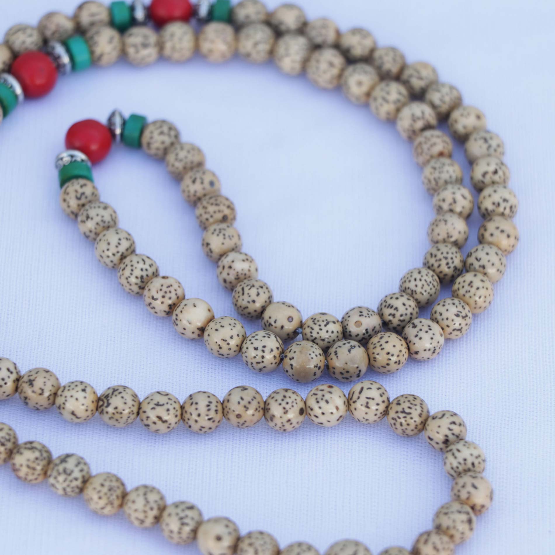 Shop Lotus Seed Mala from Lotus Mala. Handmade 108 bead prayer mala with coral spacer, ideal for meditation, relaxation, and inner peace.