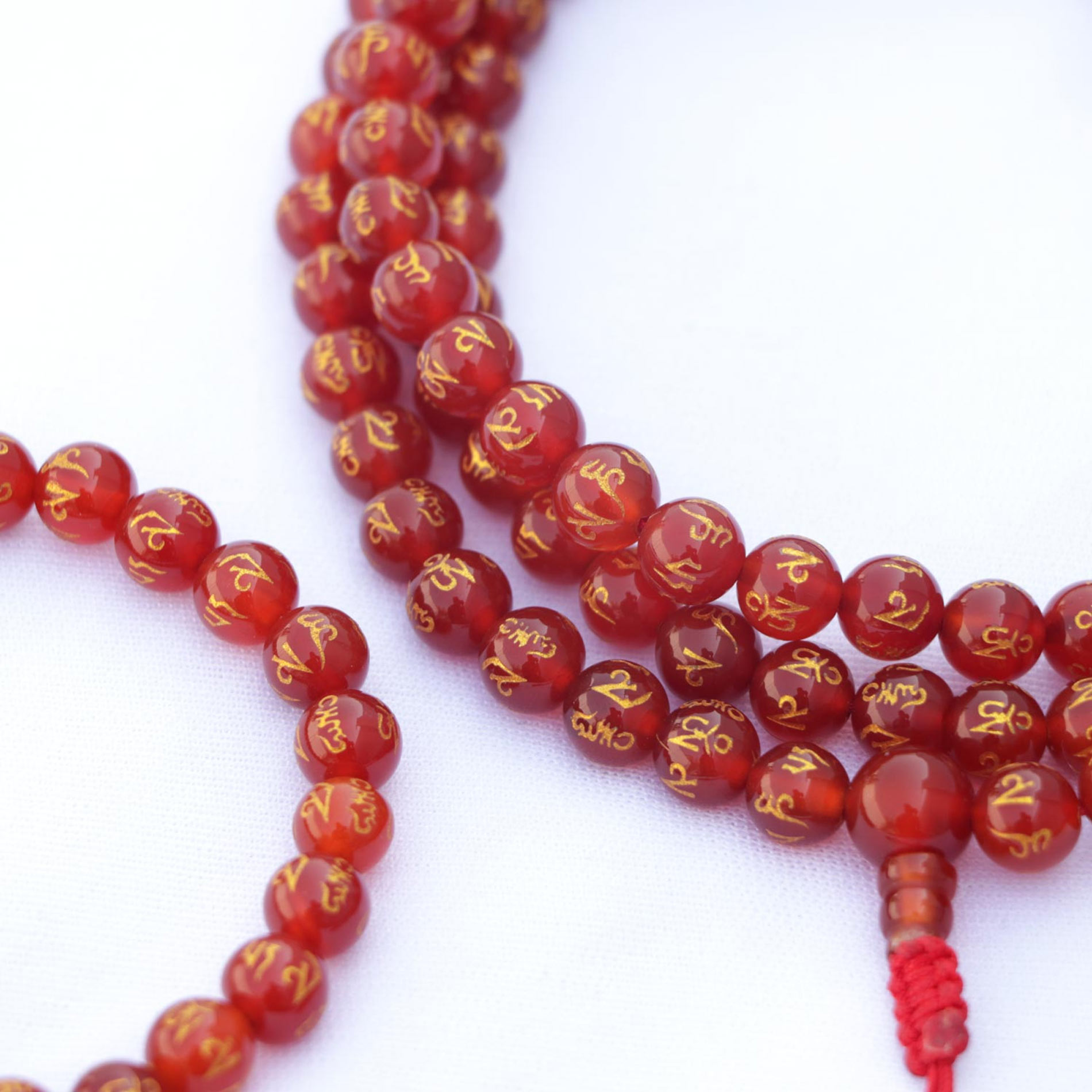 Invest in the finest Mantra Carved Carnelian Stone Japa Mala & Wrist Mala/ Bracelet Set from Lotus Handicrafts (Lotus Mala).
