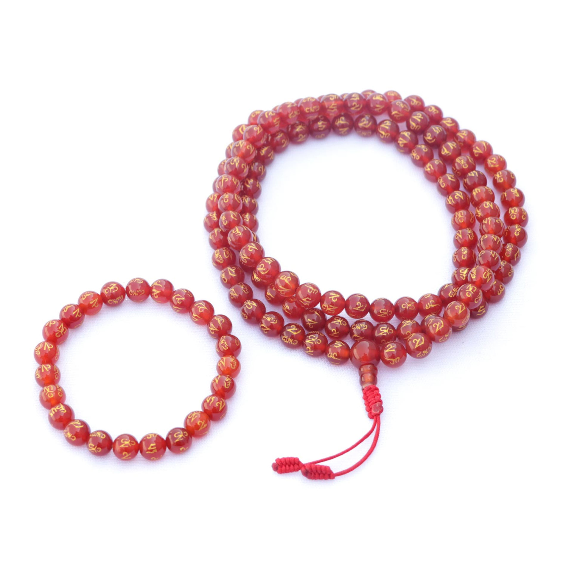 Mantra Carved Carnelian Stone Japa Mala & Wrist Mala/ Bracelet Set