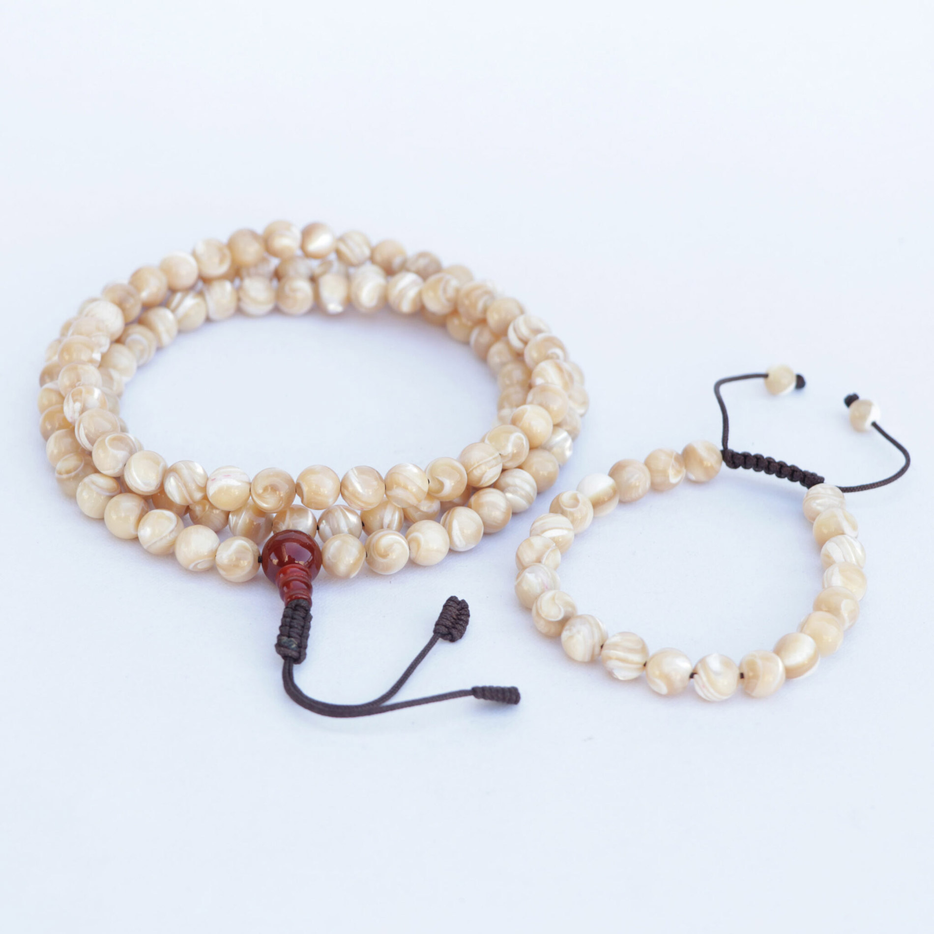 Upgrade your standard to Mother Of Pearl Stone Japa Mala & Wrist Mala Pair from Lotus Handicrafts (Lotus Mala).