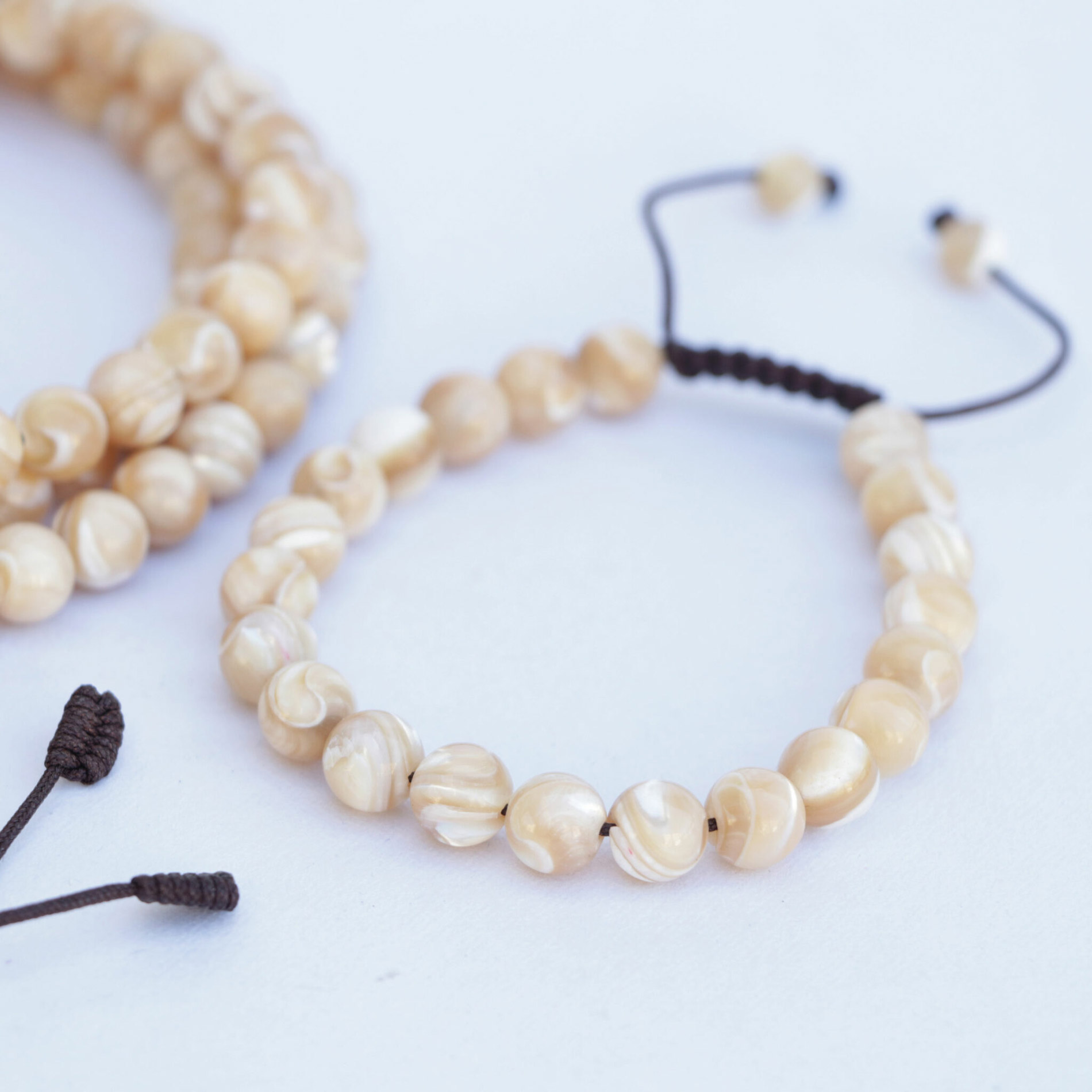 Invest in the finest Mother Of Pearl Stone Japa Mala & Wrist Mala Pair at the best price and at your convenience from Lotus Handicrafts (Lotus Mala), one of the best wholesalers and distributors of stone mala and experts at handicrafts in Nepal.