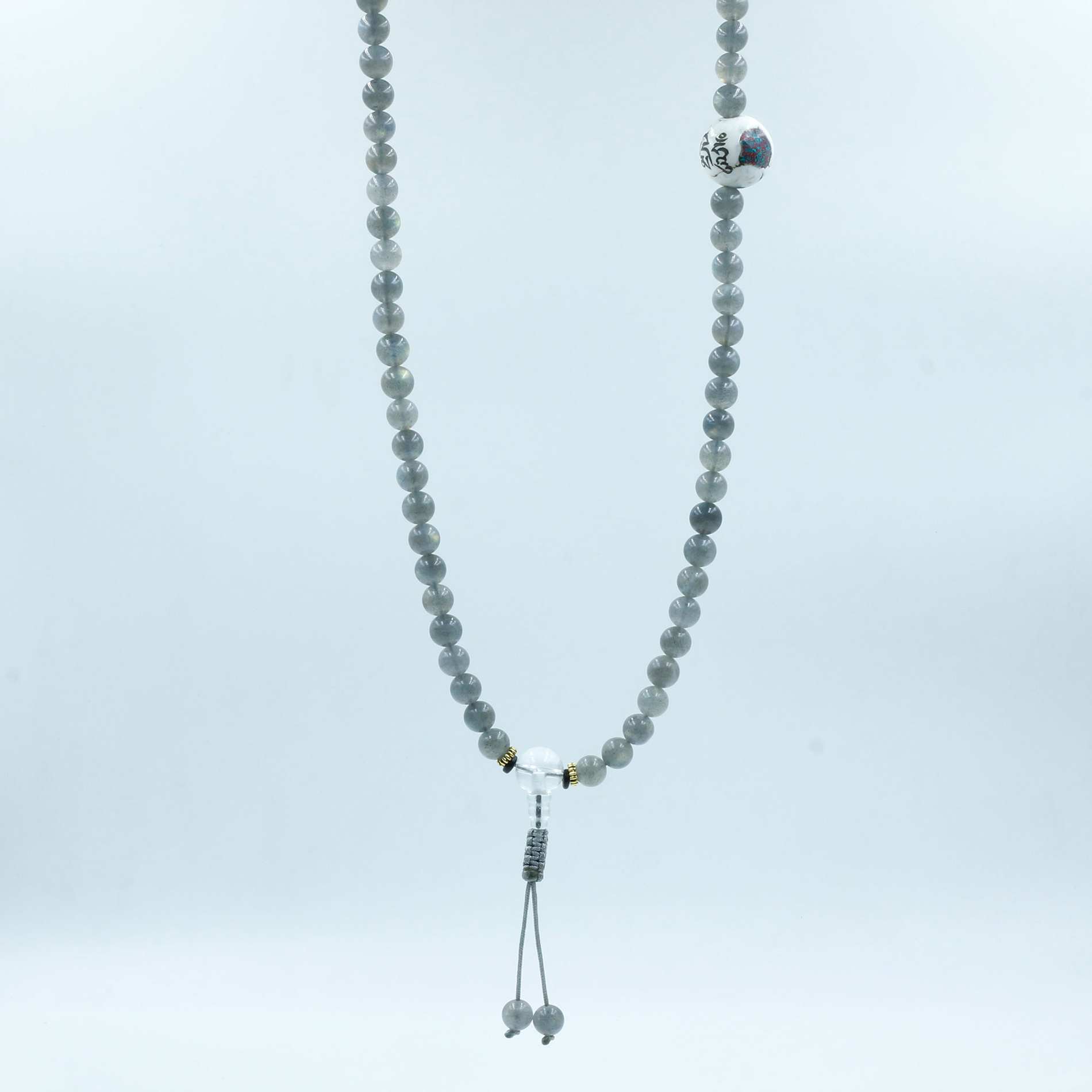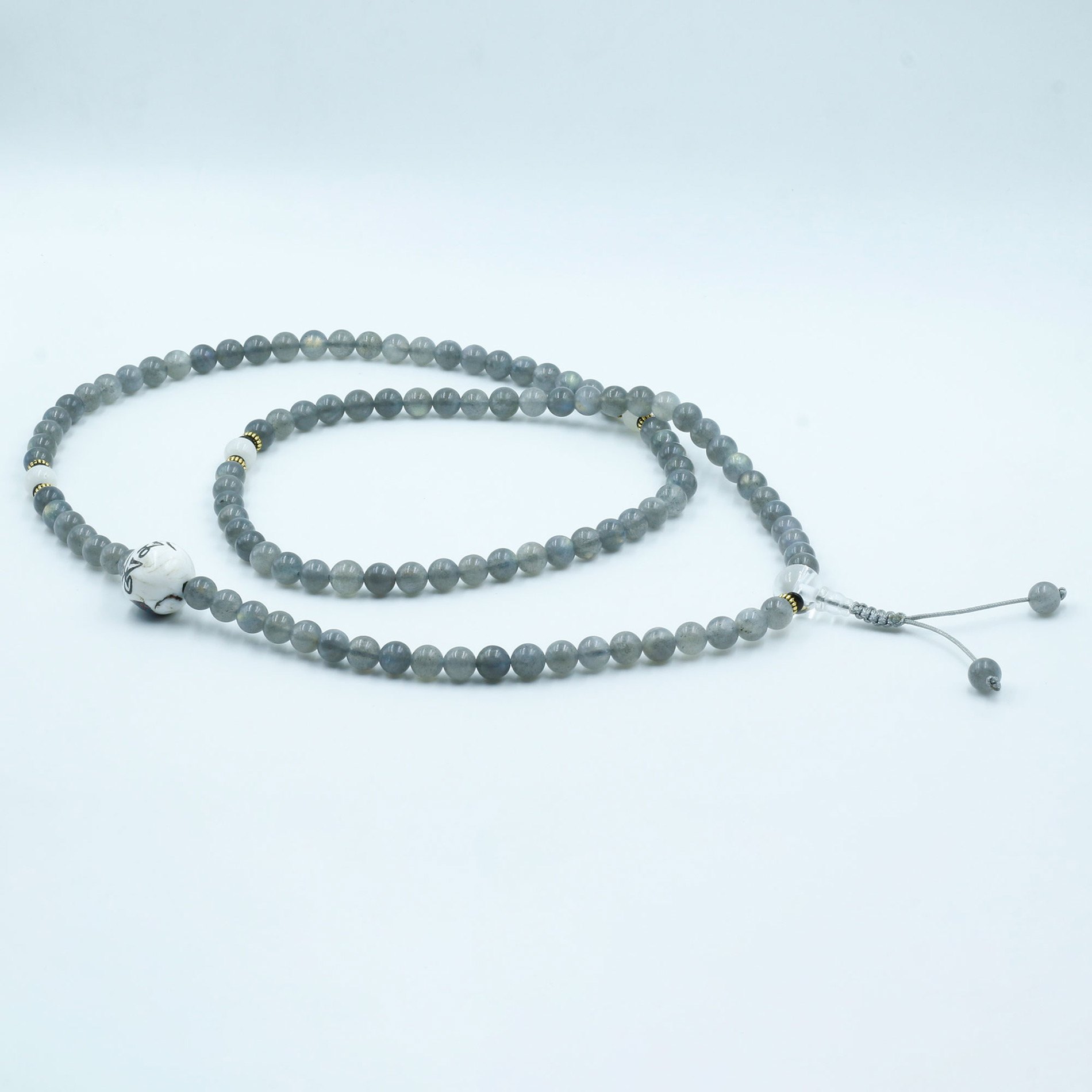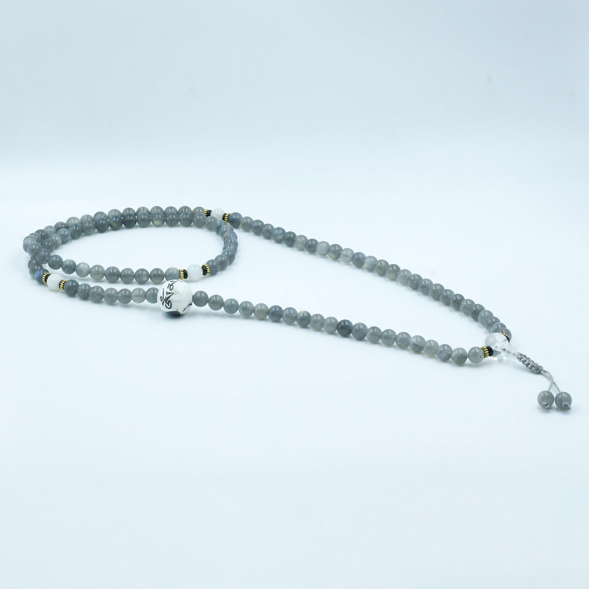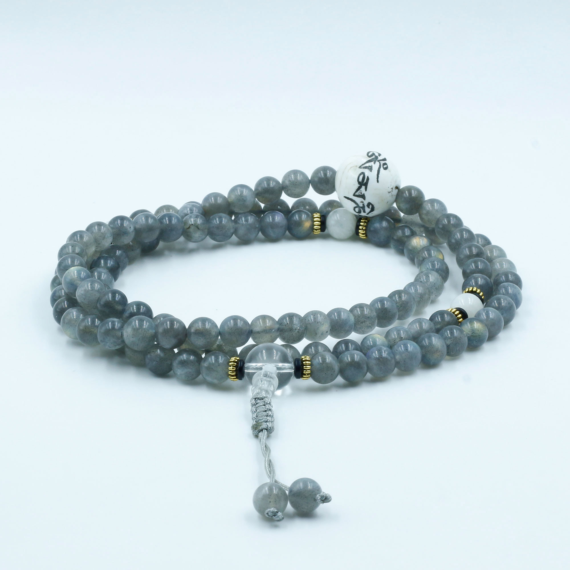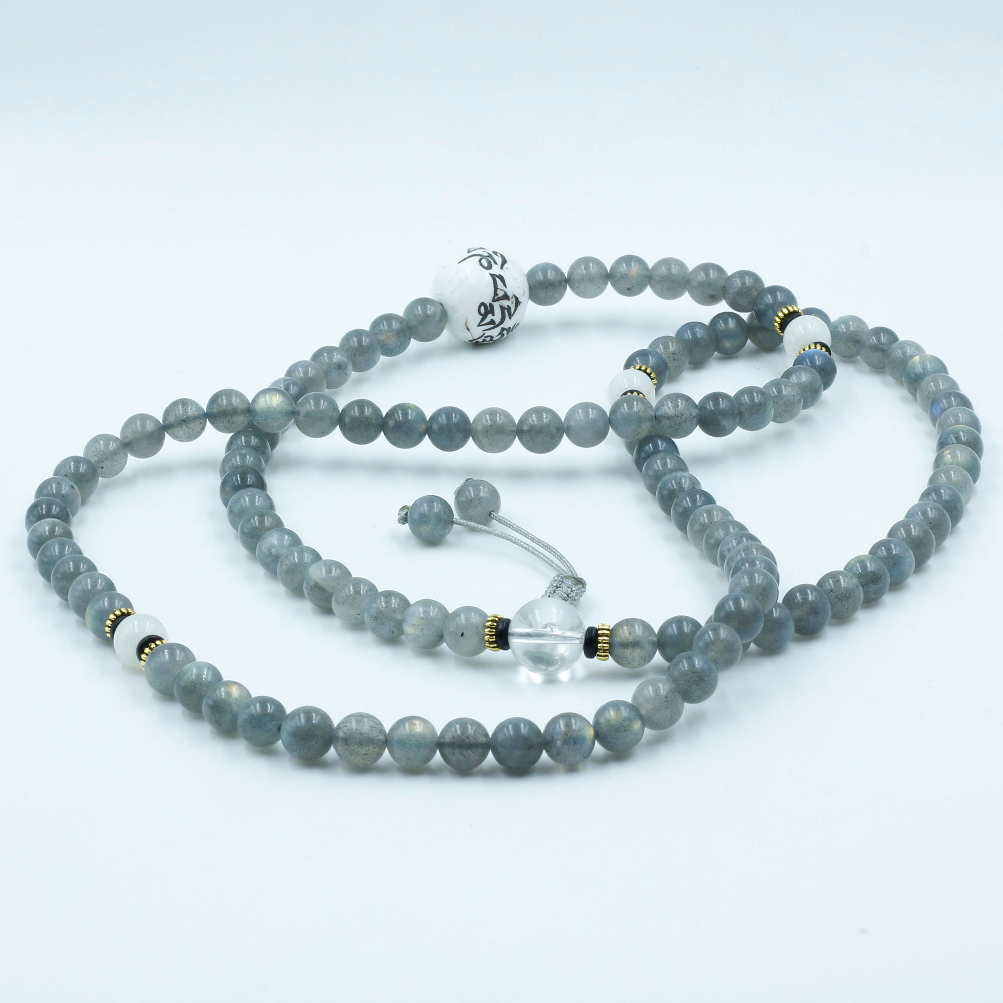 Embrace the flawless Mystic Grey Moonstone Mala with Tibetan Mantra Conch Shell Pendant from Lotus Mala (Lotus Handicrafts).