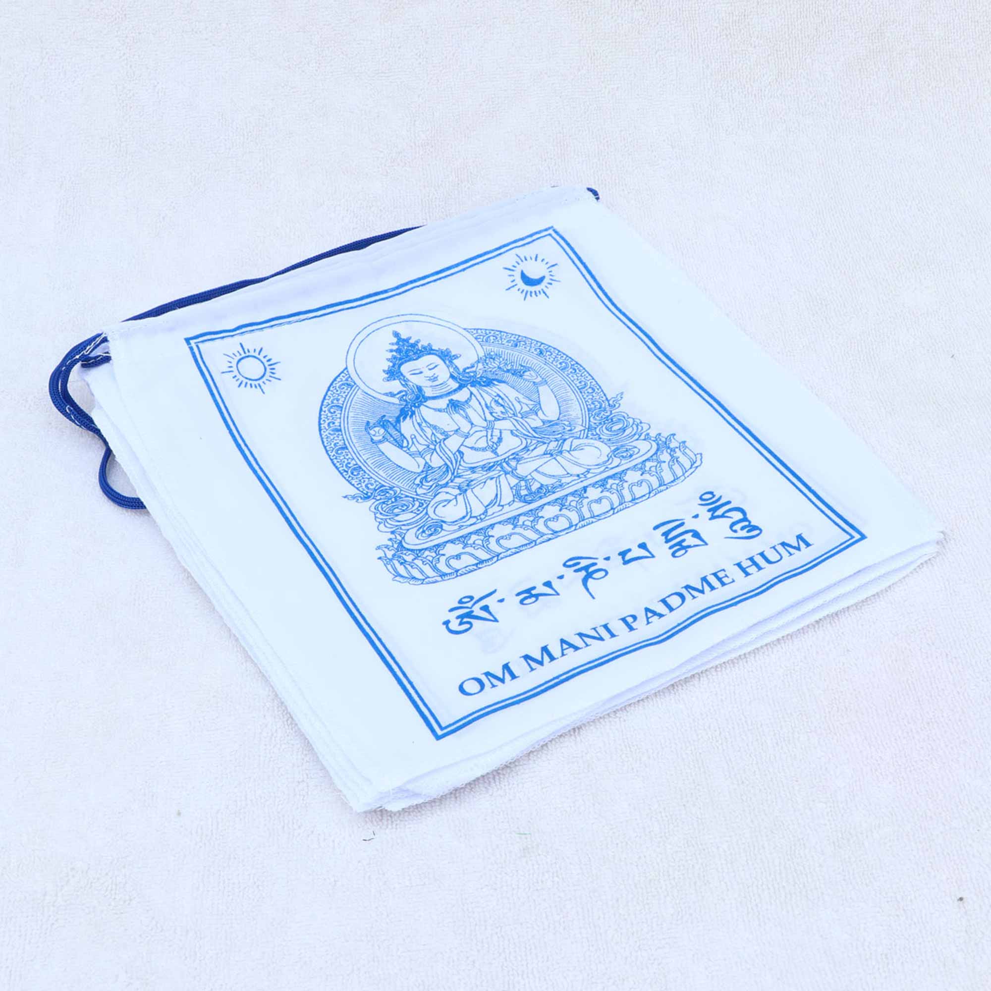 The Om Mani Padme Hum prayer flags embody this sacred teaching. Inscribed with the powerful Mani mantra, these prayer flags are traditionally hung so that the wind carries their prayers and blessings across the surroundings. As they flutter, the mantra is believed to spread compassion, peace, wisdom, and harmony to all beings touched by the air, making them a meaningful spiritual and decorative addition to any sacred space.