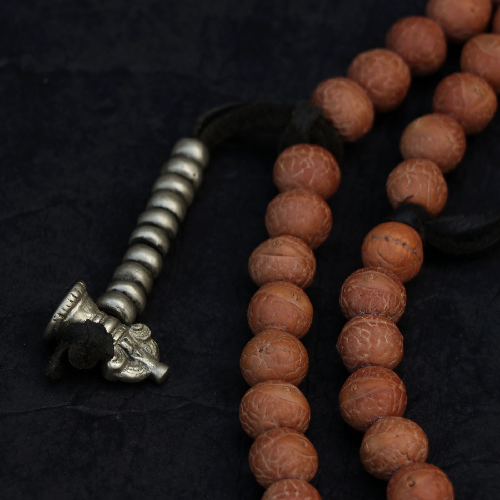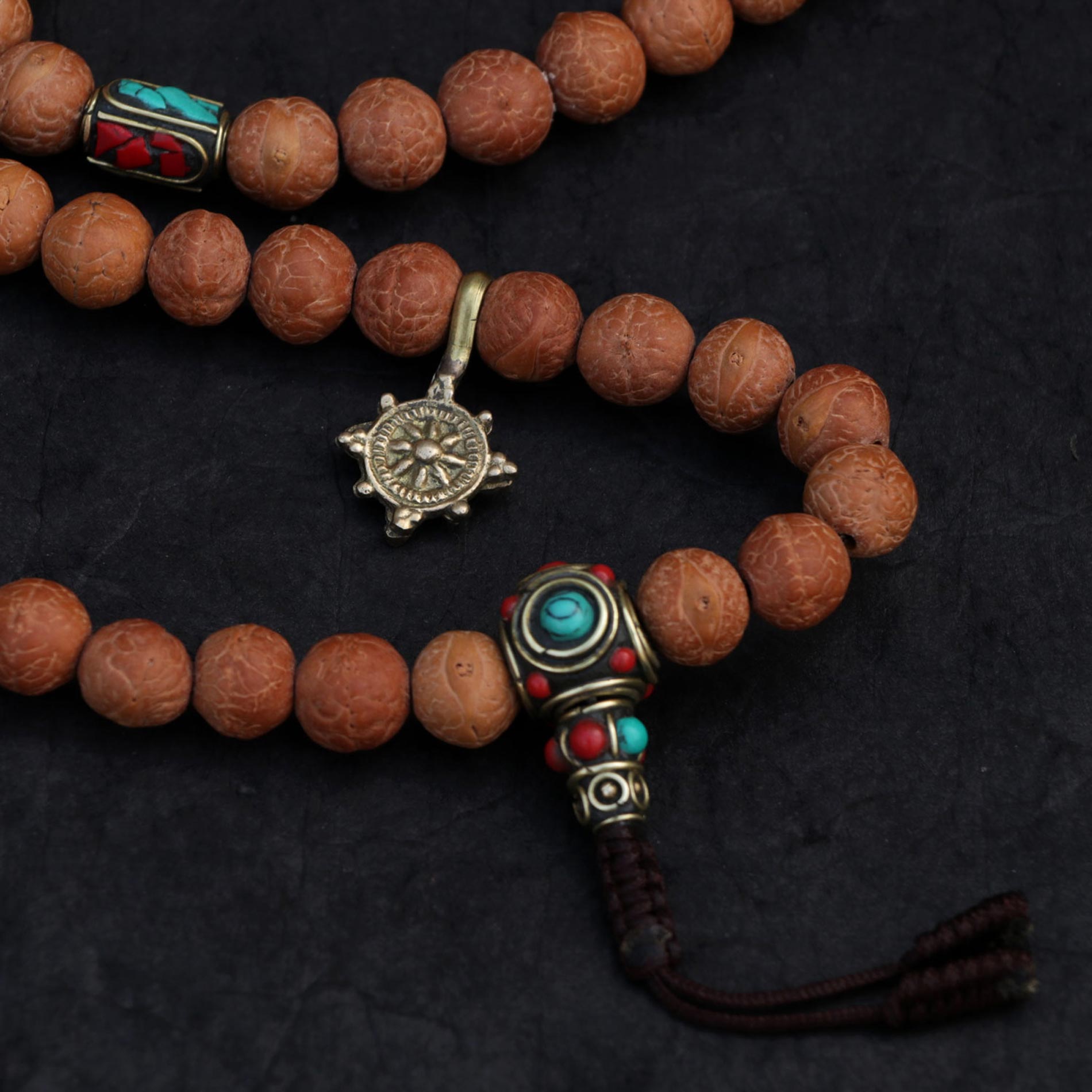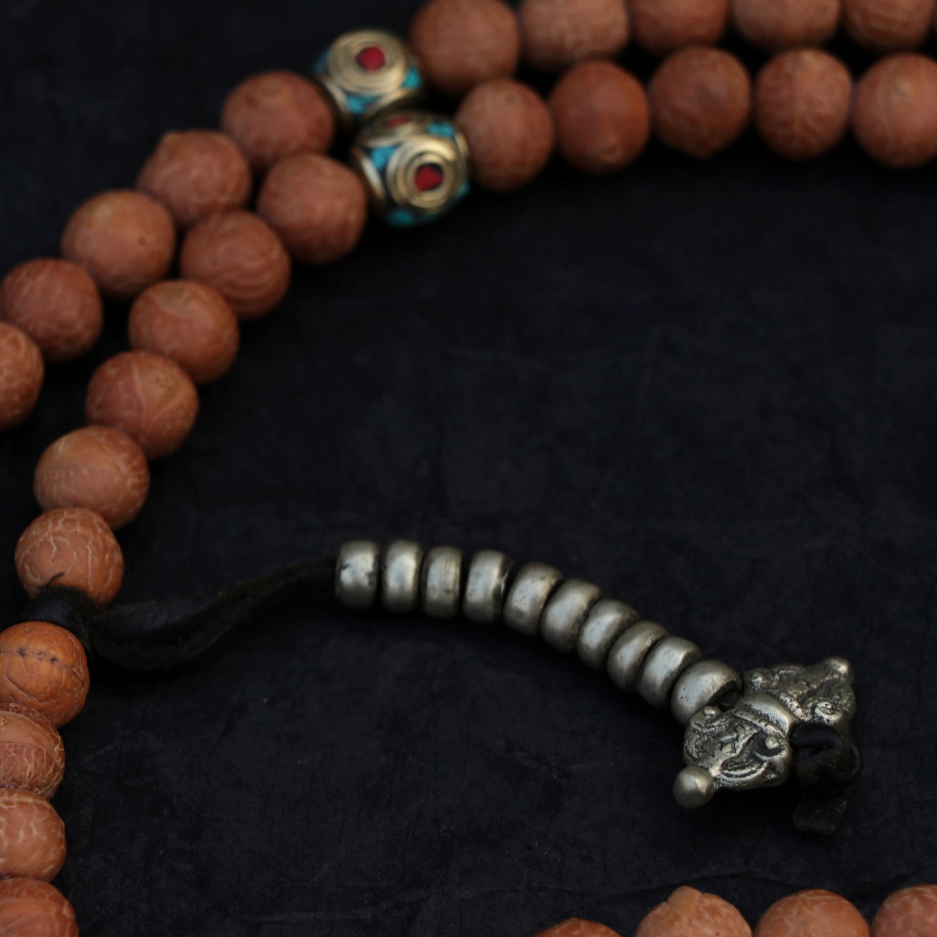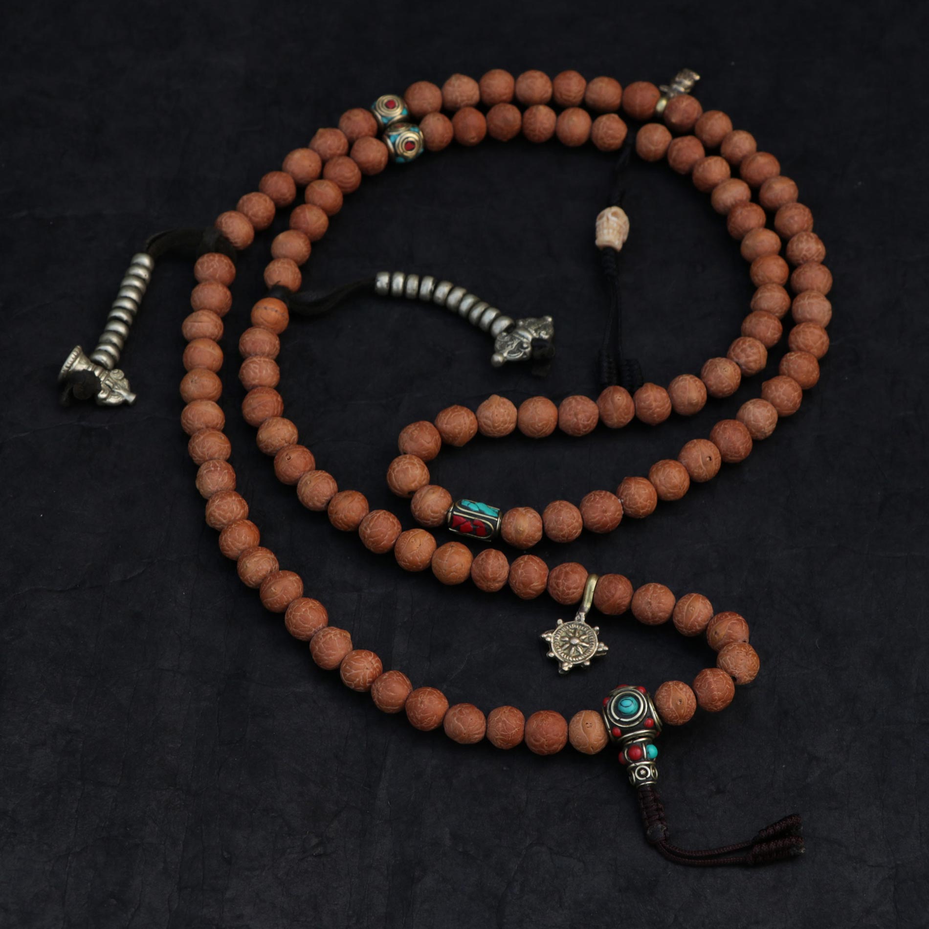 - Material: Bodhi Seed, brass beads, brass mala counters, yak bone (skull)