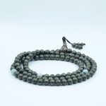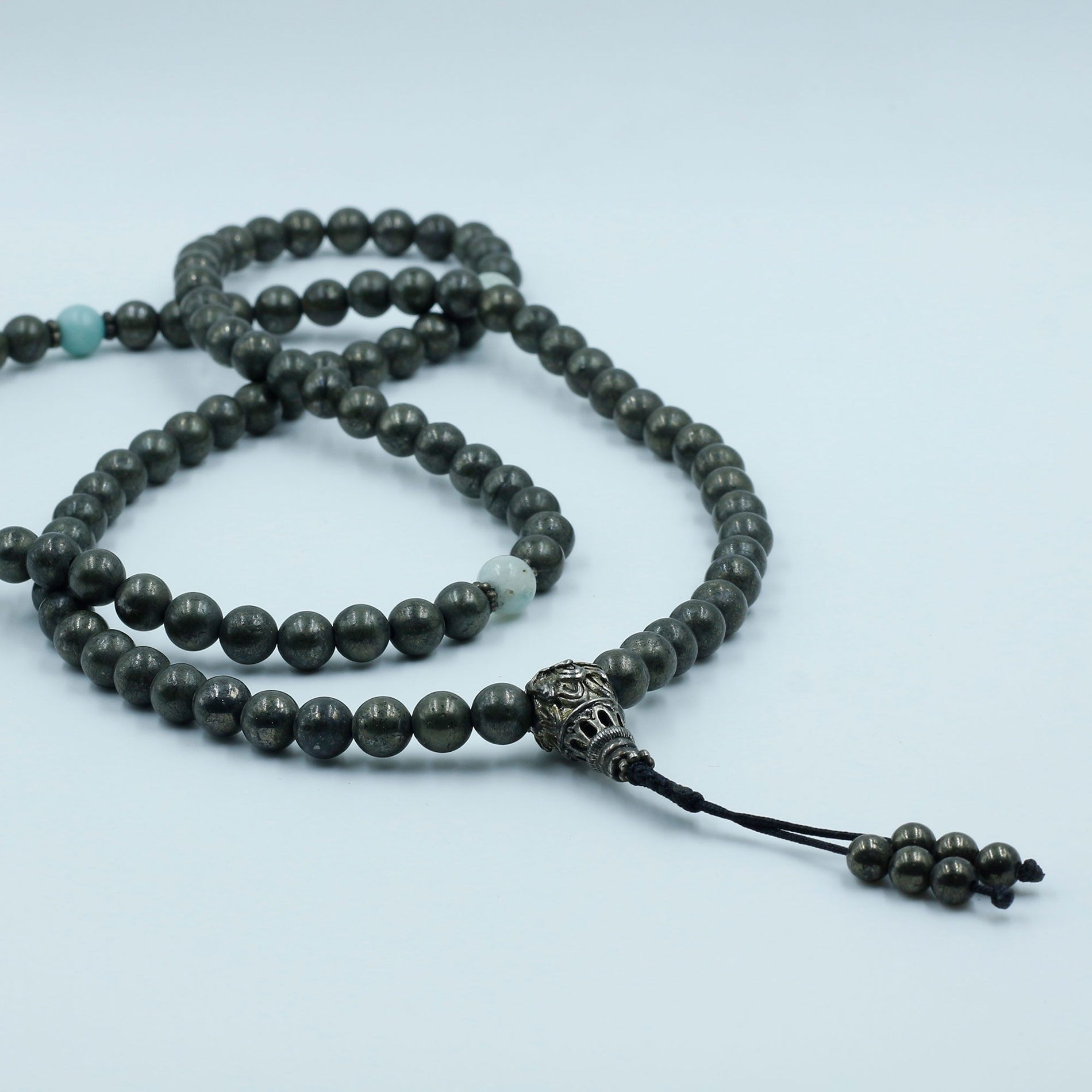 - Handcrafted in Nepal featuring 108 pyrite beads, three turquoise spacer beads, and a white metal lotus guru bead