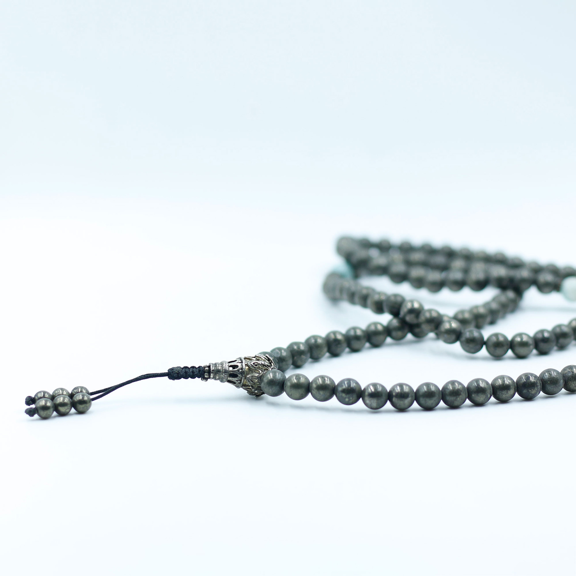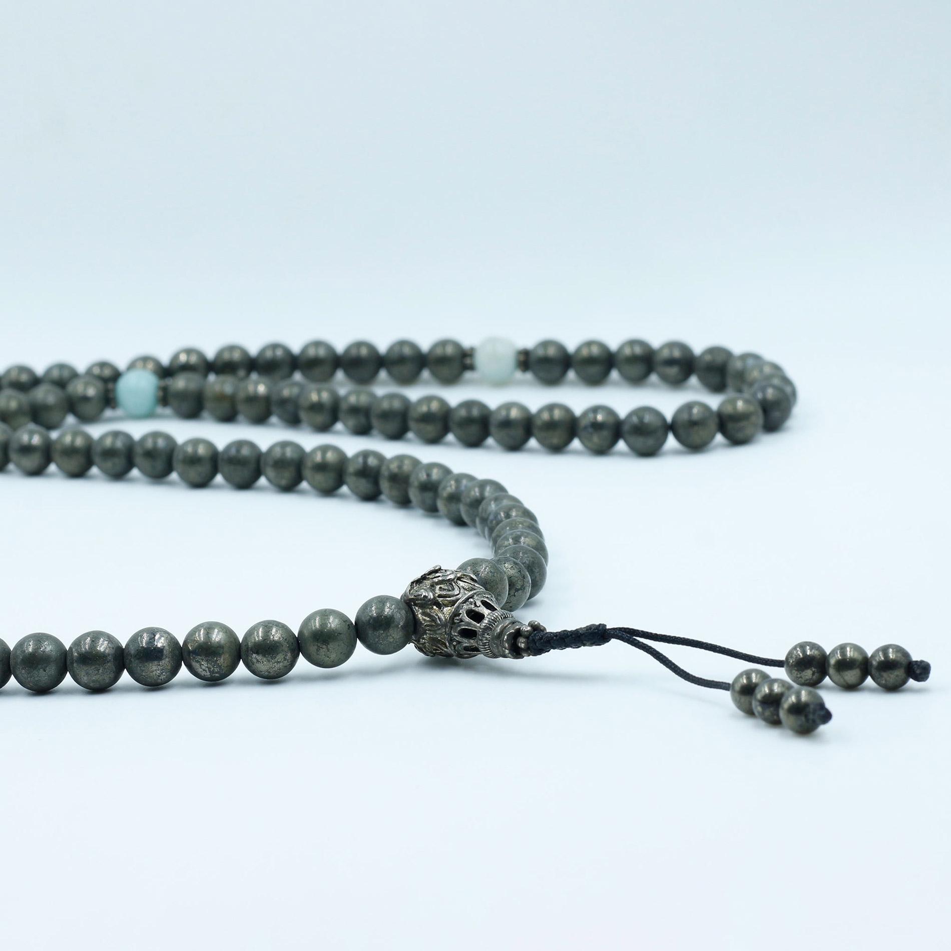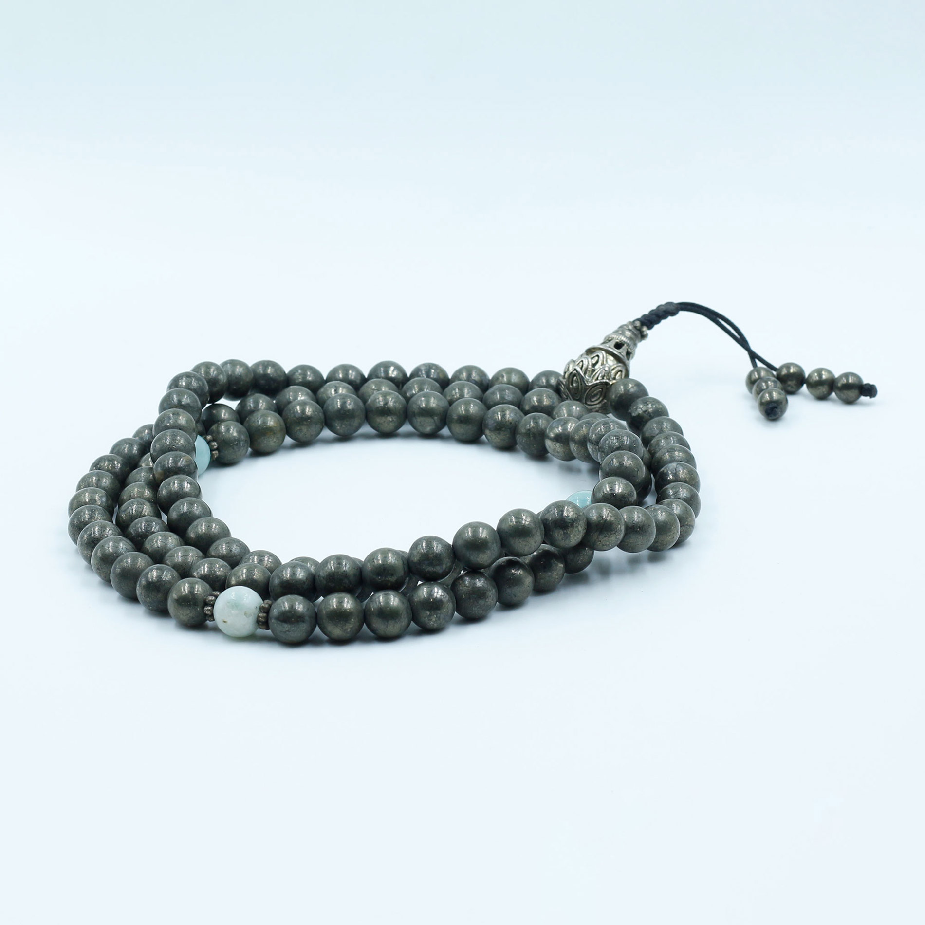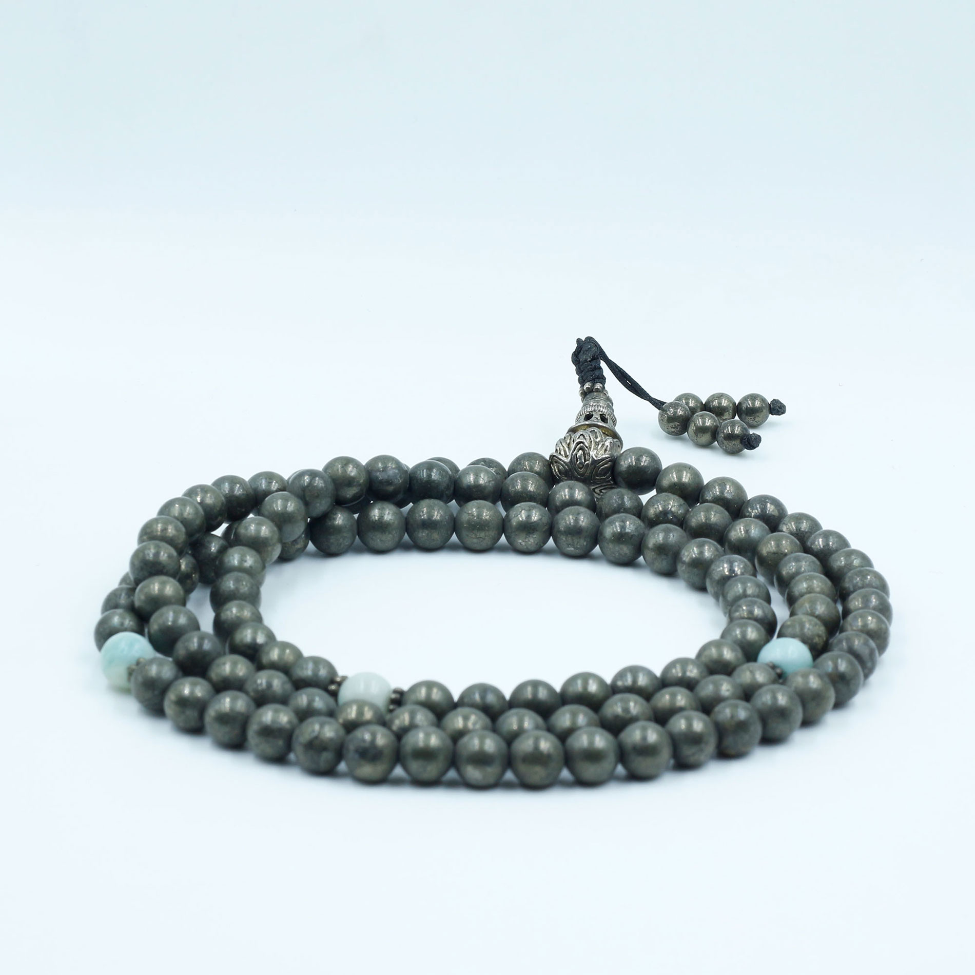 Bead Count: 108 pyrite stones + 3 turquoise stones + 1 Metal Lotus Guru Bead