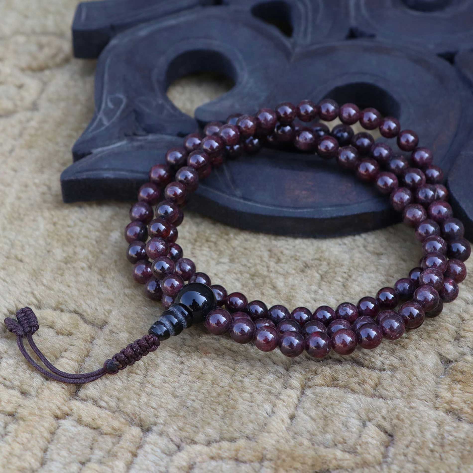 - Handcrafted in Nepal featuring 108 purple-black onyx and garnet stone beads at 6 mm on a brown cord with sliding knot
