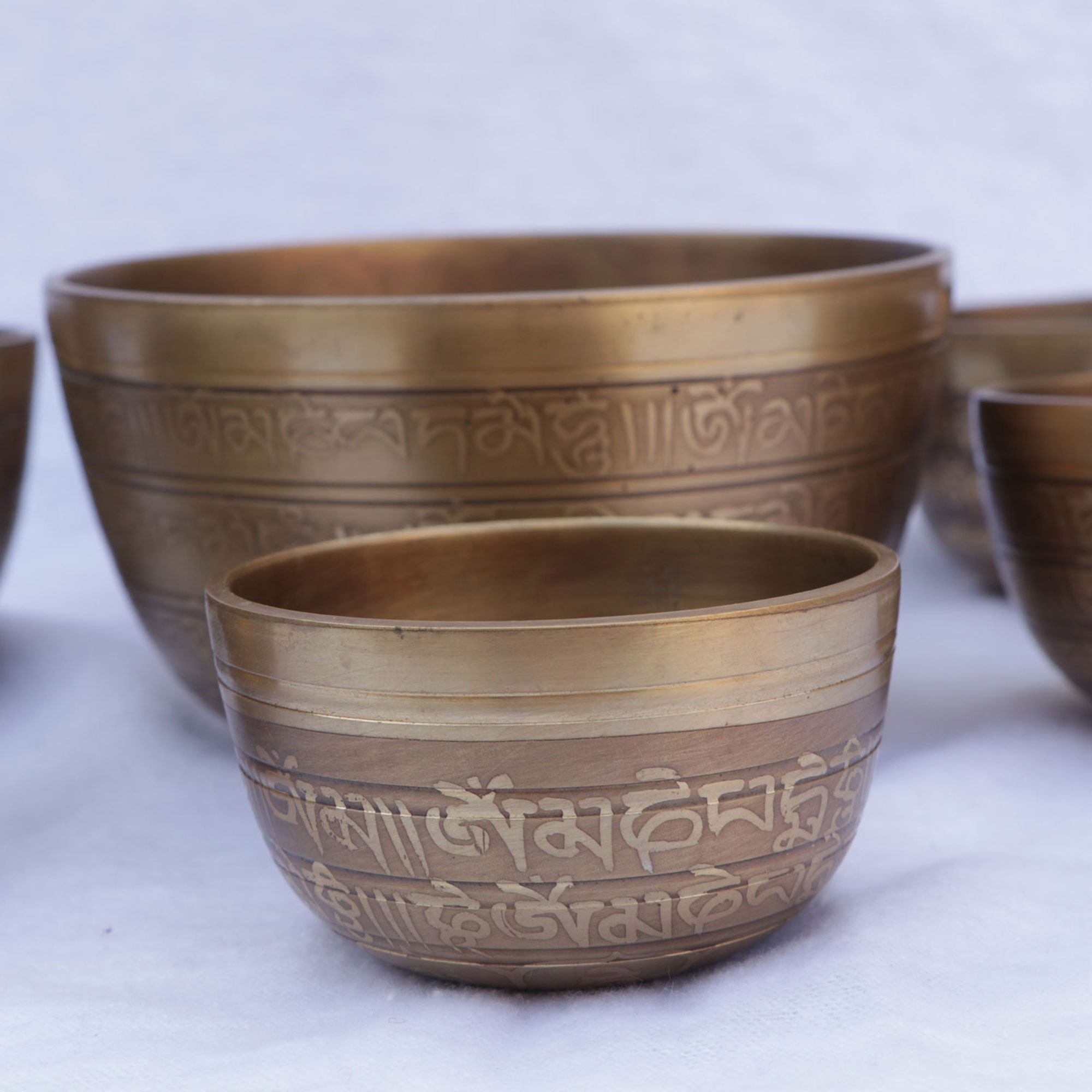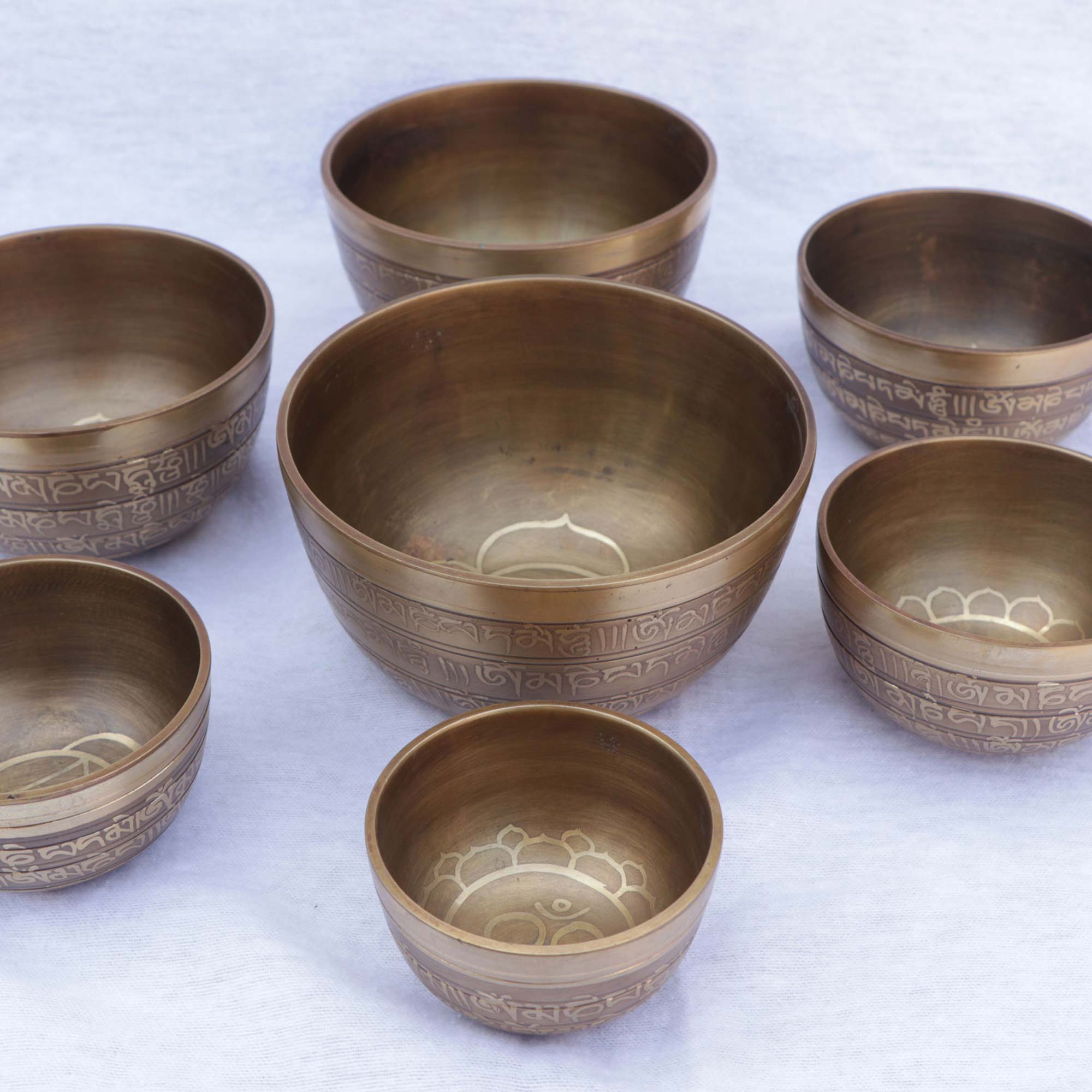 Buy the Seven Chakra Balancing Etching Singing Bowl from Lotus Mala.