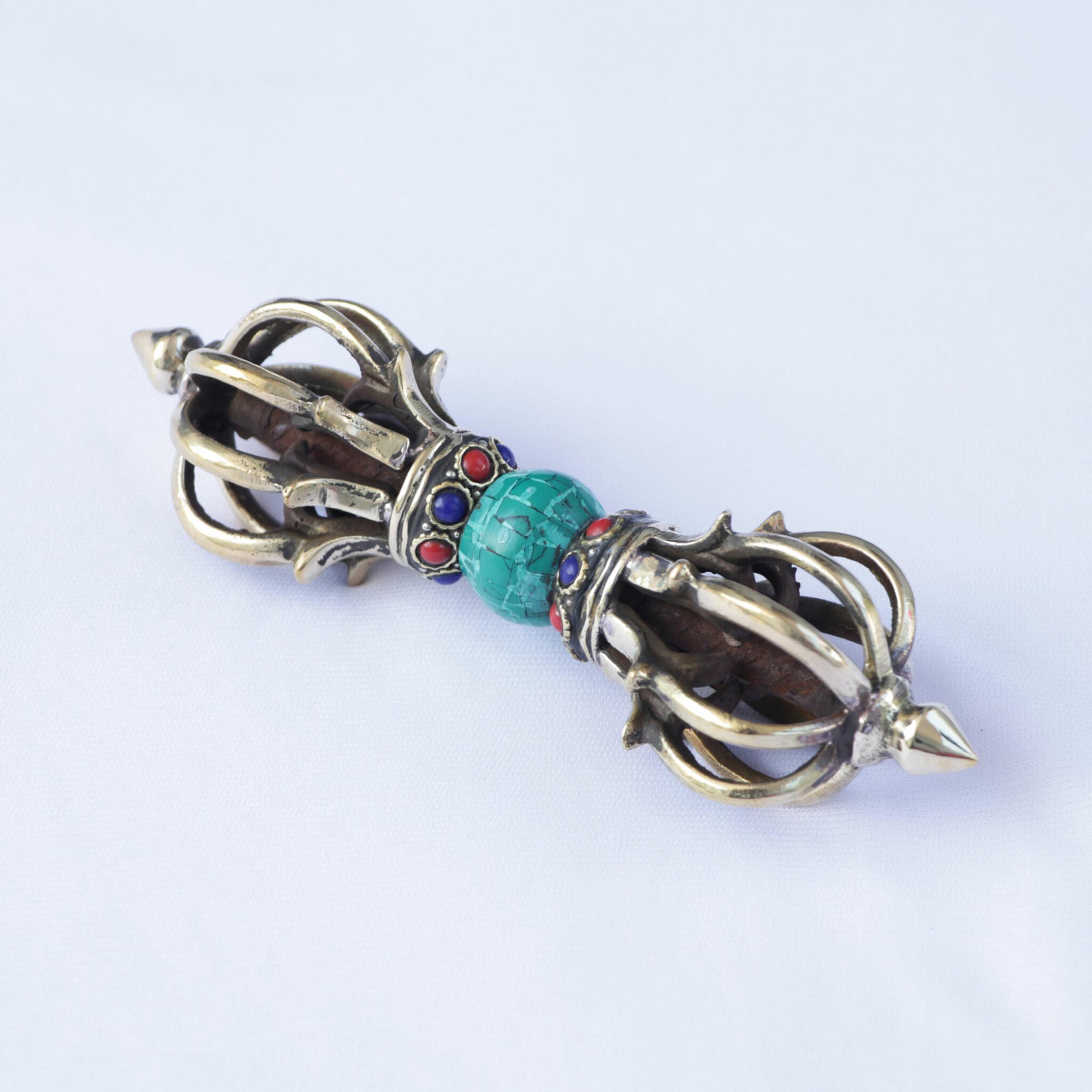 Bring home the stone-inlaid Tibetan brass vajra/dorje from Lotus Mala (Lotus Handicrafts) and invite protection, balance, and awakened energy into your spiritual journey.