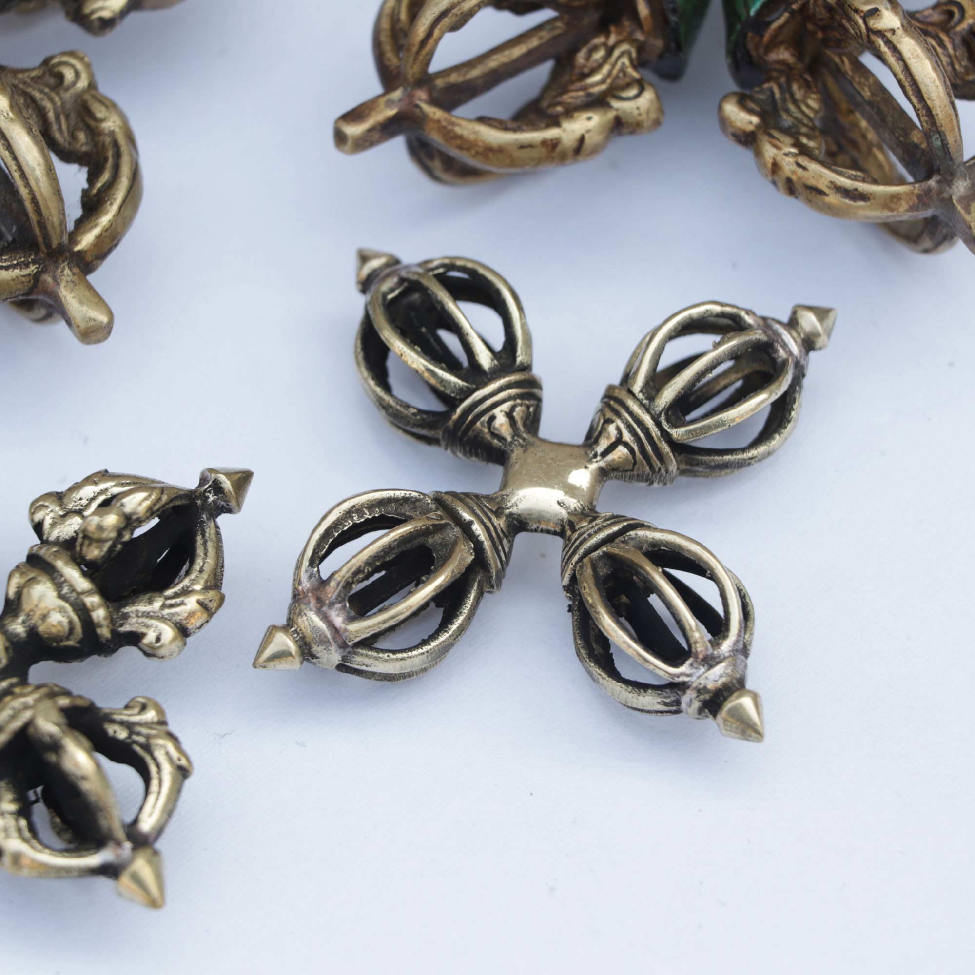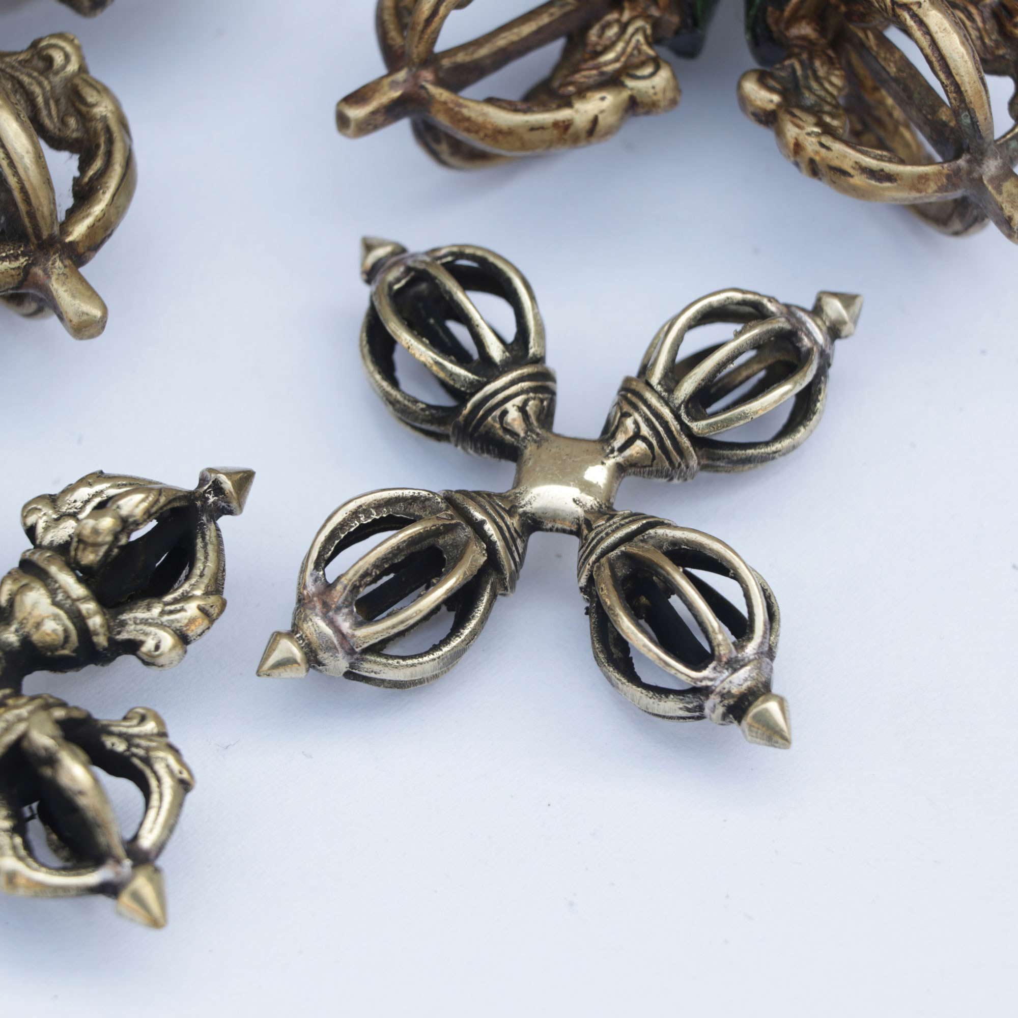 The Brass and Copper Crossed Dorje / Vajra is a sacred ritual symbol widely used in Vajrayana Buddhist practices.