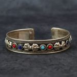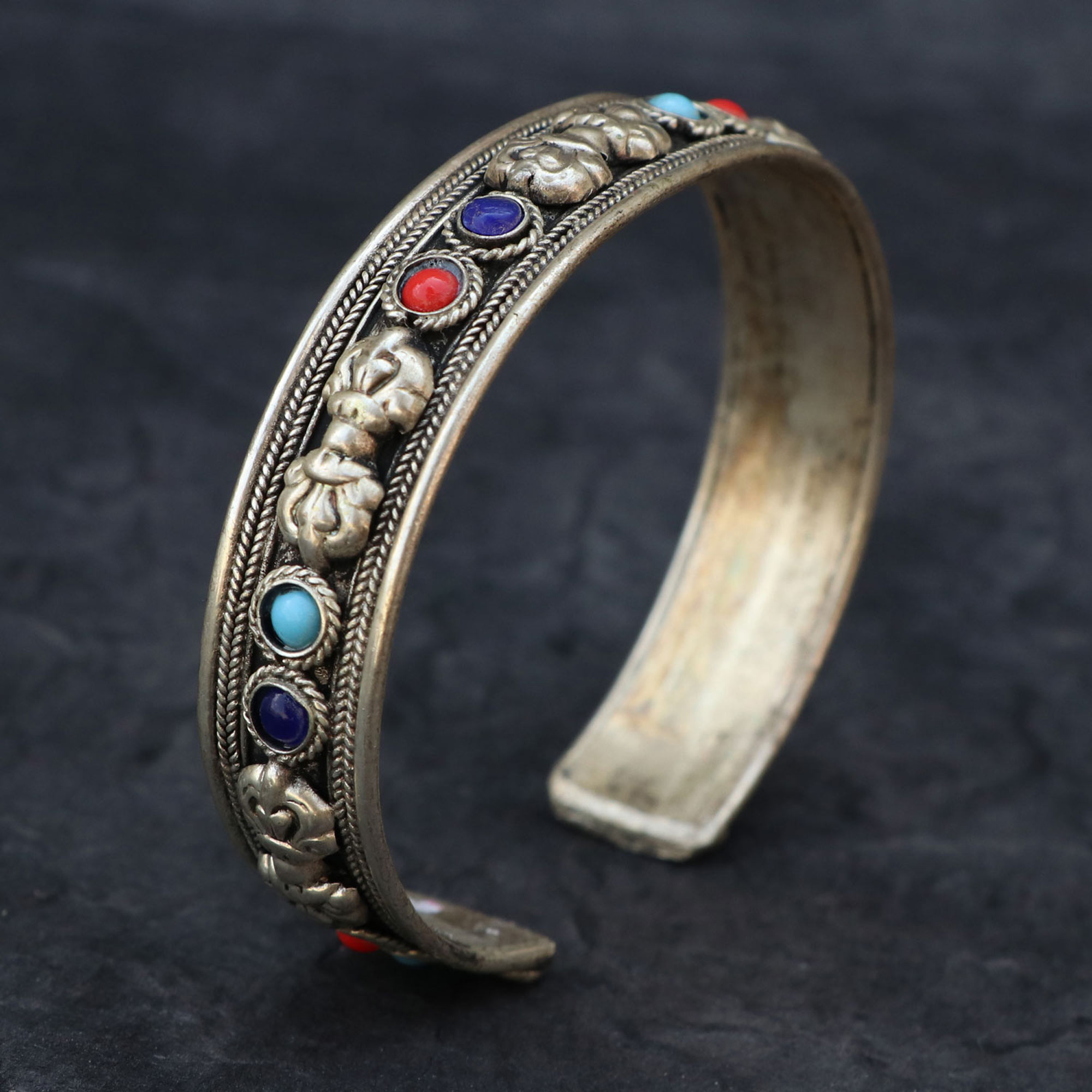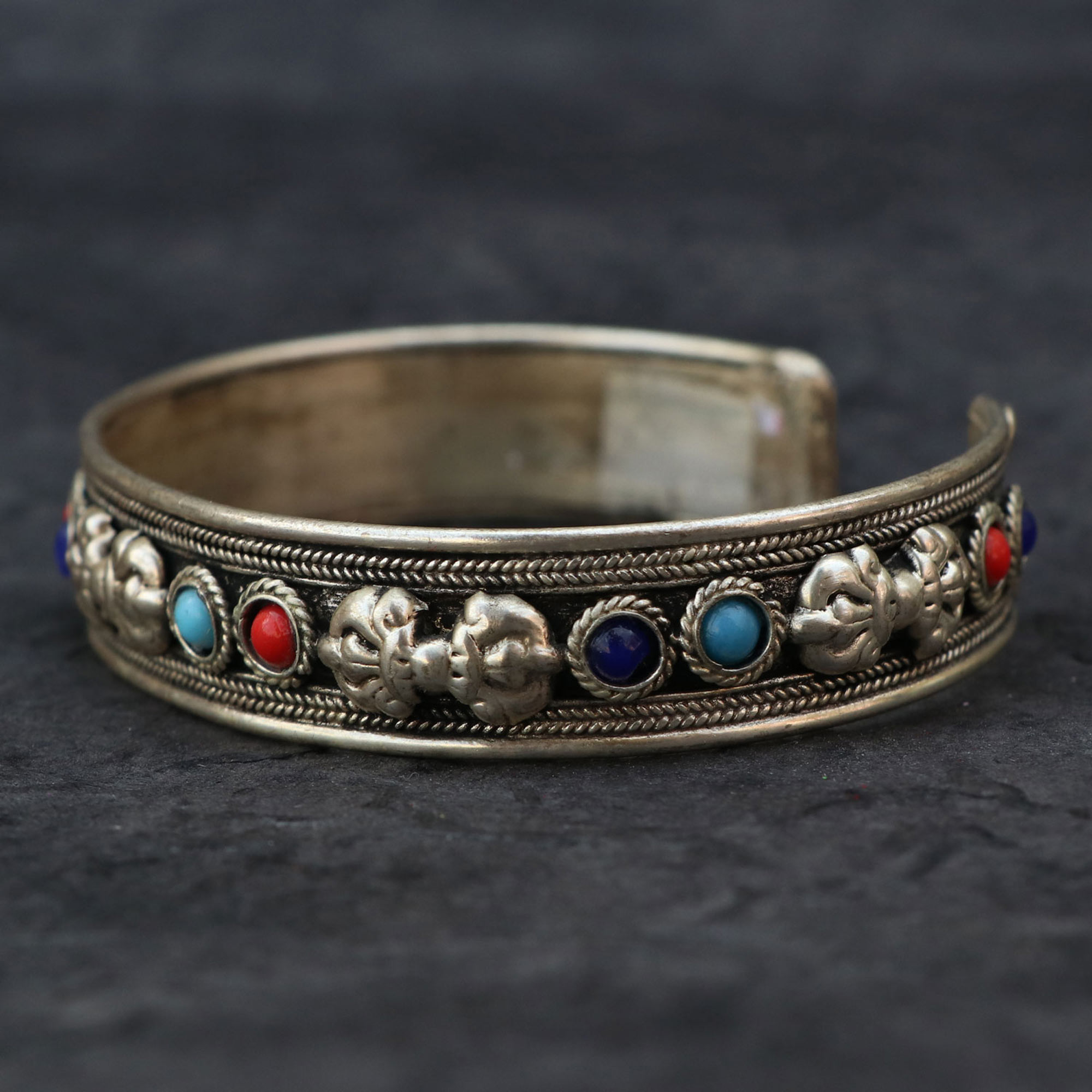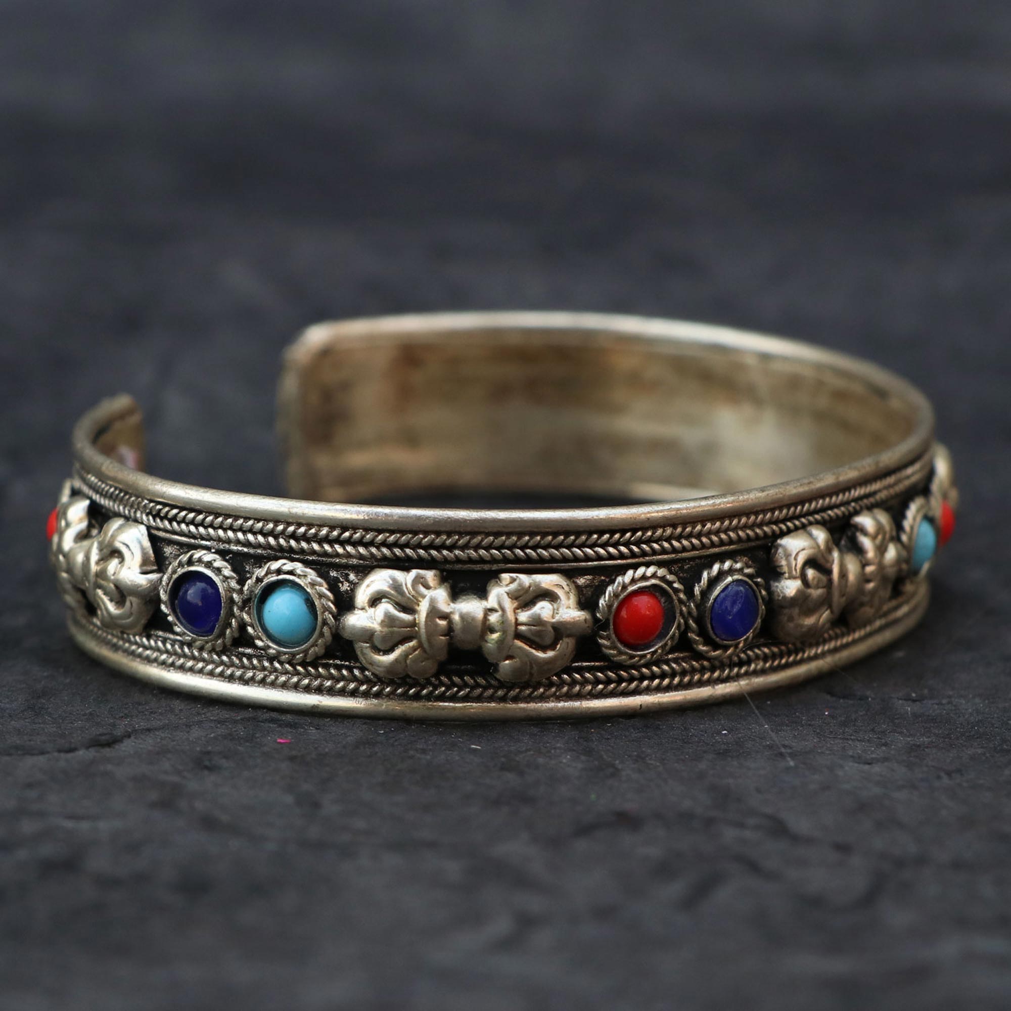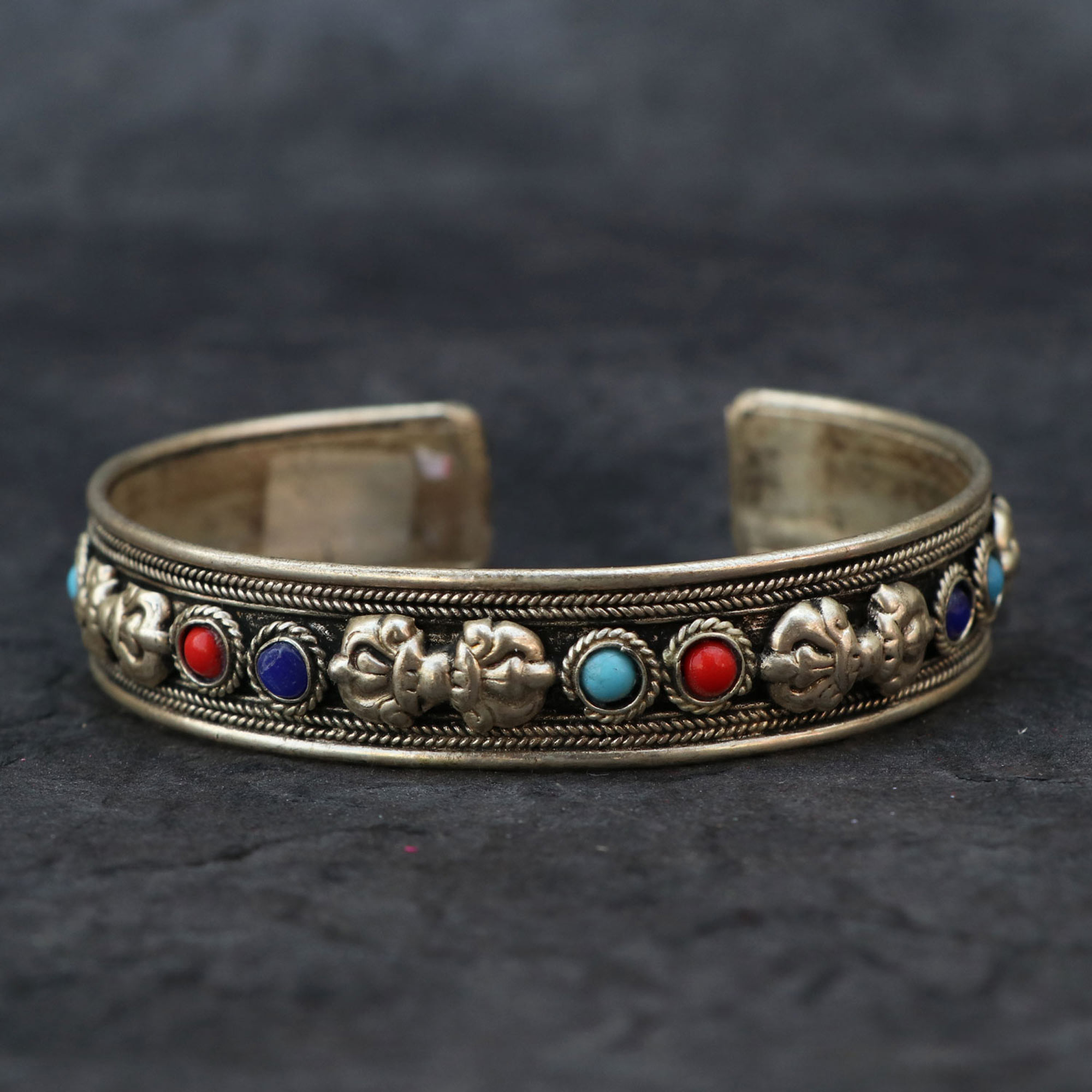 Experience the power of spiritual protection and elegance with the Lotus Mala Tibetan Dorjee Metal Bracelet. Crafted from white metal and adorned with imitation lapis lazuli, turquoise, and coral gemstones, this bracelet is intricately carved with the Dorjee symbol, representing the unstoppable force of kindness and the strength of the thunderbolt.