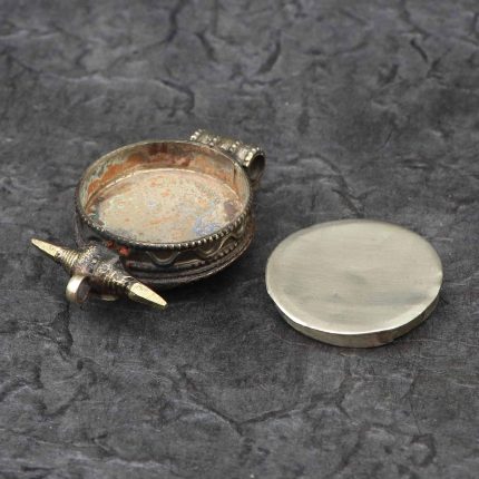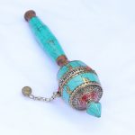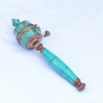 The Tibetan Inlaid Stone Hand Prayer Wheel is a sacred ritual instrument deeply rooted in Tibetan Buddhist tradition and widely used by individuals across all spiritual paths and backgrounds. Each clockwise rotation of the prayer wheel is traditionally believed to activate the blessings of the mantras contained within, generating positive karma and helping to remove obstacles along the path toward enlightenment — for the benefit of the individual and all beings. One full rotation is commonly regarded as equivalent to the oral recitation of the enclosed mantras, making this a deeply meaningful and accessible tool for daily meditation, devotional practice, and mindful living. This prayer wheel is meticulously handcrafted from copper and brass by skilled Nepali artisans — two metals traditionally valued for their spiritual and metaphysical properties. Brass is often associated with courage, strength, and protective energy, while copper is believed to support balance, positive energy flow, and a strengthened connection between the physical and spiritual. The wheel is beautifully inlaid with turquoise stone, a gem traditionally associated with healing, clarity, and the alignment of the chakras — particularly the Heart Chakra, where it is believed to encourage compassion, emotional balance, and an open and giving quality of awareness. The vibrant turquoise inlay adds considerable aesthetic beauty to the piece, complementing the warm tones of the copper and brass and resulting in a prayer wheel that is as visually refined as it is spiritually significant. Whether used daily in personal practice, placed on a meditation altar, or offered as a meaningful spiritual gift, this prayer wheel represents the finest meeting of sacred tradition and Nepali artisanal craft.