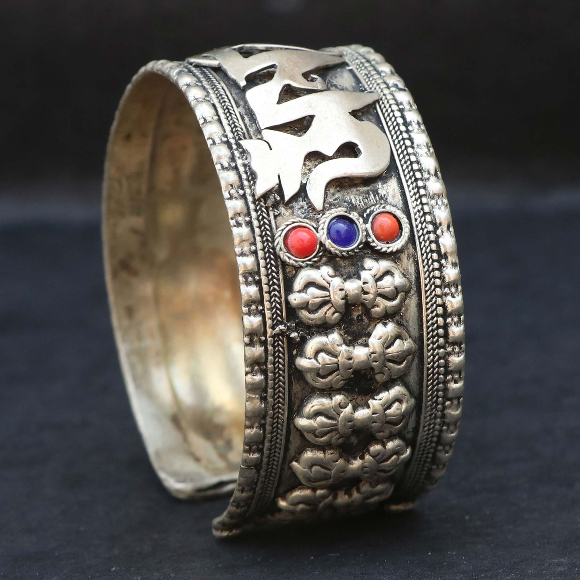 Experience protection, wisdom, and spiritual balance with the Lotus Mala Tibetan Mantra & Dorje Carved Bracelet. This meaningful piece is crafted from a white metal base and beautifully adorned with lapis lazuli and coral stones, along with intricate carvings of a Tibetan mantra and Double Dorje symbol.