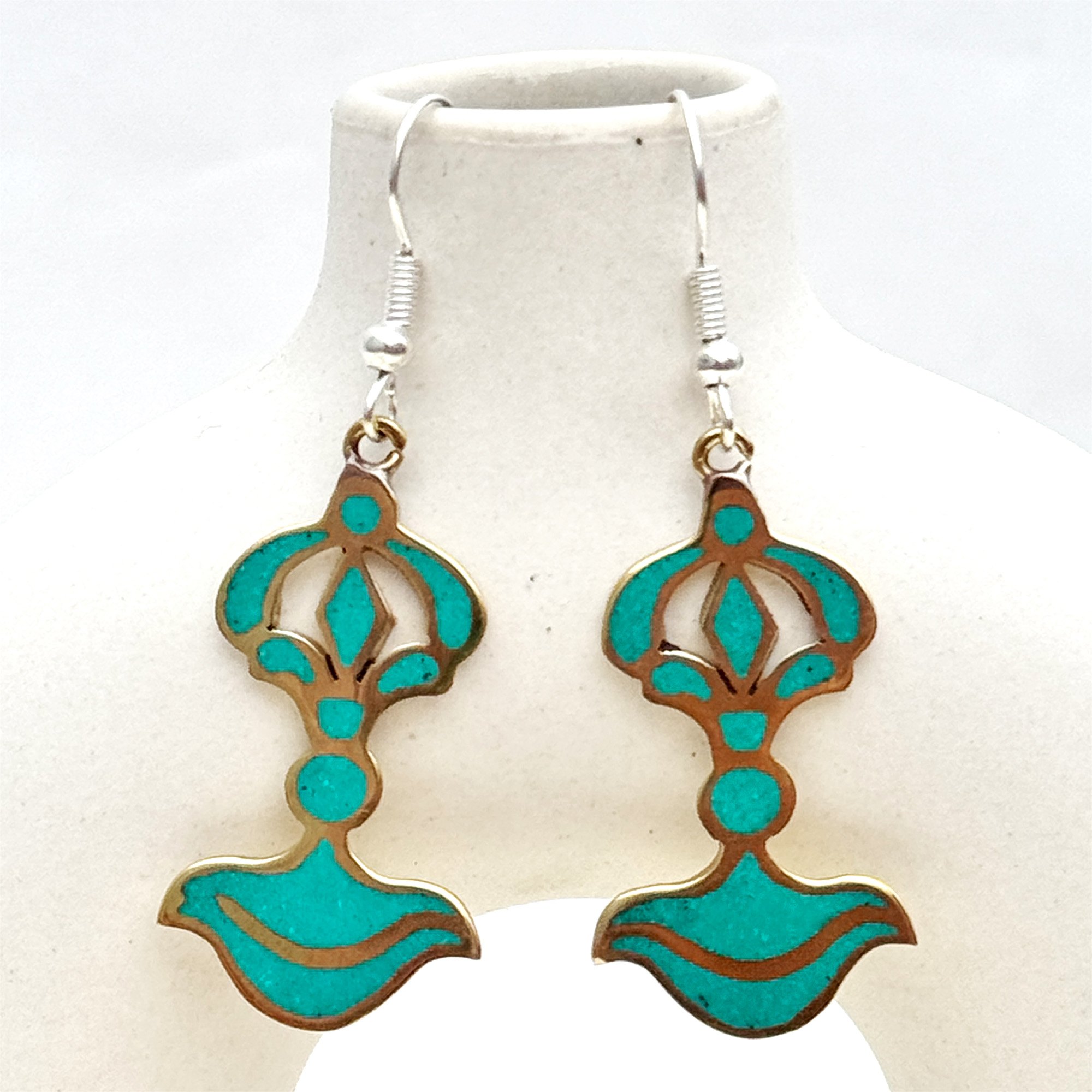 Turquoise Bajra Metal Earrings are a striking and powerful piece of jewelry, meticulously crafted from high-quality metal and beautifully inlaid with turquoise stone. Each earring features the sacred Bajra (Vajra) symbol, a prominent ritual object in Hinduism and Buddhism, particularly in Tibetan Buddhism. The Bajra represents the power of thunderbolt and the diamond’s indestructibility, symbolizing spiritual strength, enlightenment, and the firm resolve to overcome obstacles.The calming turquoise stone adds a soothing charm, making these earrings perfect for both daily wear and special occasions.