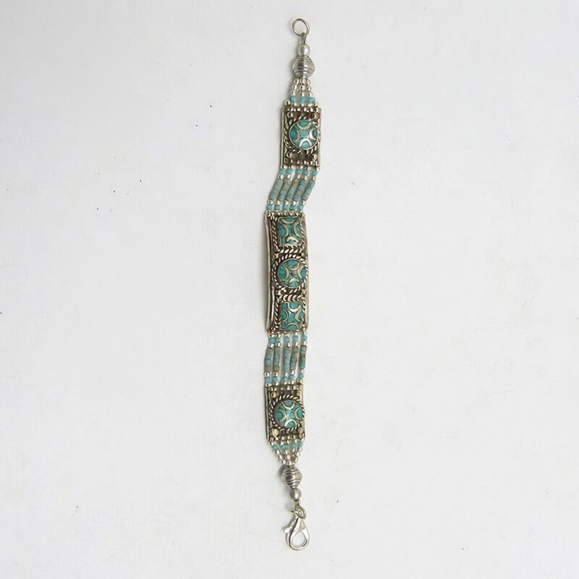 The turquoise gemstone, known as the stone of communication, promotes self-expression, clarity, and confidence in speech. The white metal base provides a calming effect on the nerves and stabilises emotions. Together, they create a bracelet that supports both emotional balance and effective communication, while its intricate design adds a touch of elegance.