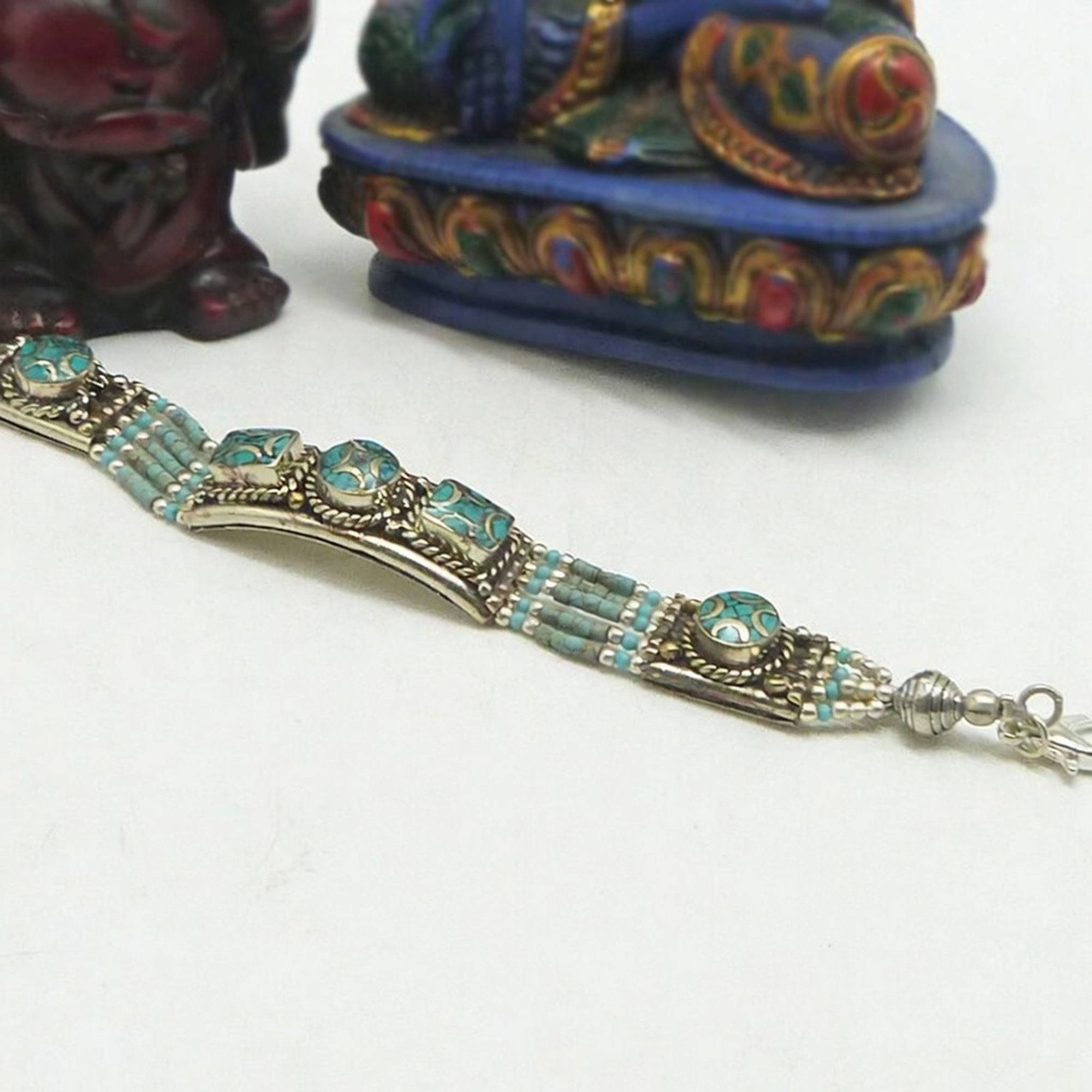Enhance communication and inner calm with the Lotus Mala Turquoise Inlaid Stone Bracelet. Handcrafted by skilled artisans in Nepal, this bracelet combines white metal and turquoise gemstone for a harmonious blend of aesthetics, energy, and well-being.