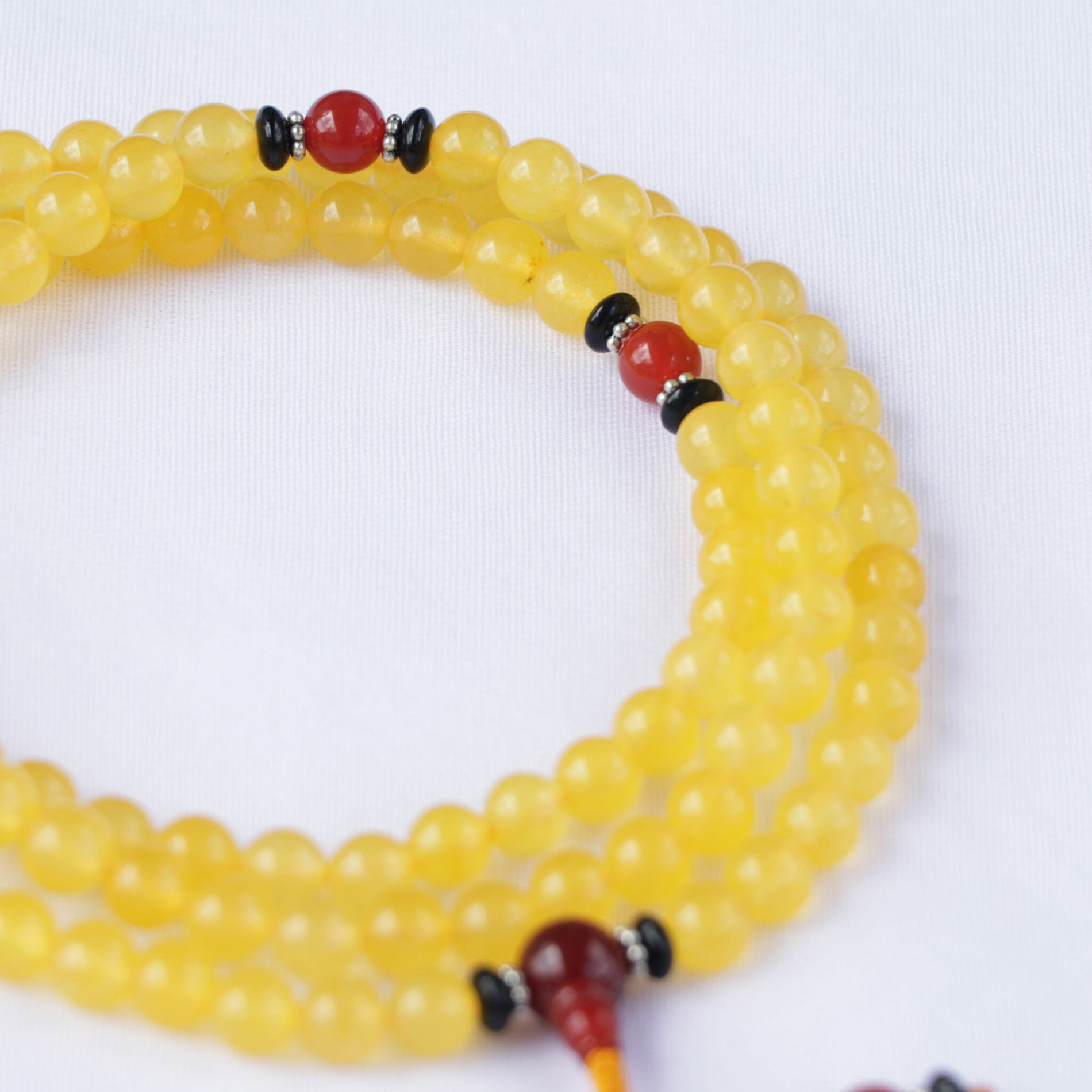 Enhance confidence, strength, and personal growth with the Yellow Honey Calcite Stone Mala with Carnelian Spacer from Lotus Mala (Lotus Handicrafts).